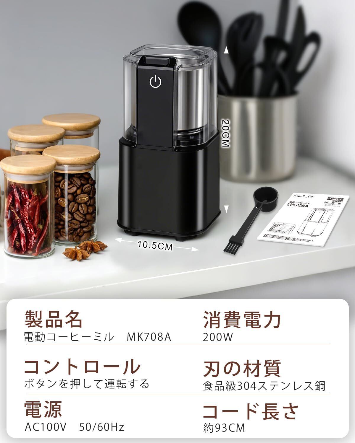 【安全設計&コンパクトなサイズ】電動コーヒーミルはお客様の安全を守るため、絶縁体・安全ラッチ・隠しスイッチのトリプルプロテクションデザインを採用し、安全性を更に高めるため、過負荷防止装置も搭載しております。コンパクトなサイズと洗練されたデザインは、キッチンやオフィスのスペースを取らず、手軽に美味しいコーヒーを楽しめます。軽量で持ち運びやすいため、自宅、職場、出張など、場所を選ばずに利用できる電動コーヒーミルです。