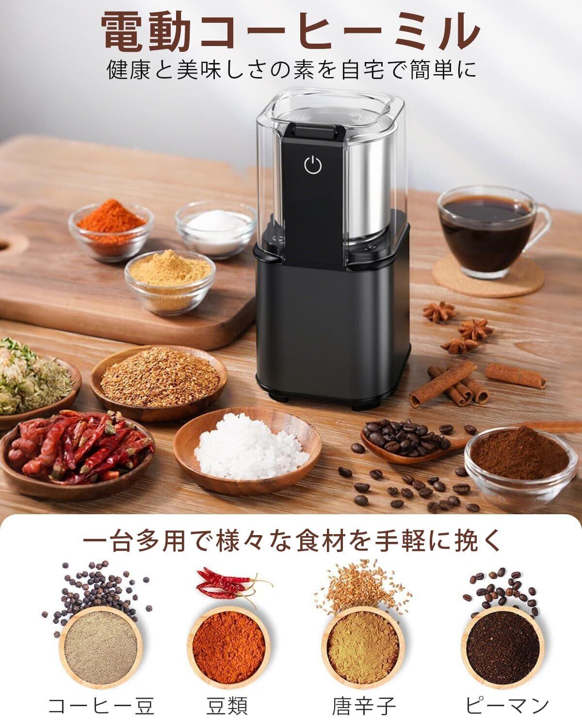 コーヒーミル 電動 カッター コーヒー電動ミル 電動コーヒーミル コーヒーグラインダー 電動グラインダー 粉末 コーヒー豆挽き器 豆挽き/緑茶/唐辛子/胡椒/山椒/調味料/穀物を挽く 無段階粒度調整 一台多役 掃除ブラシ付 お手入れ簡単 水洗い可能 キッチン/オフィス/リビングルーム 誕生日 プレゼント