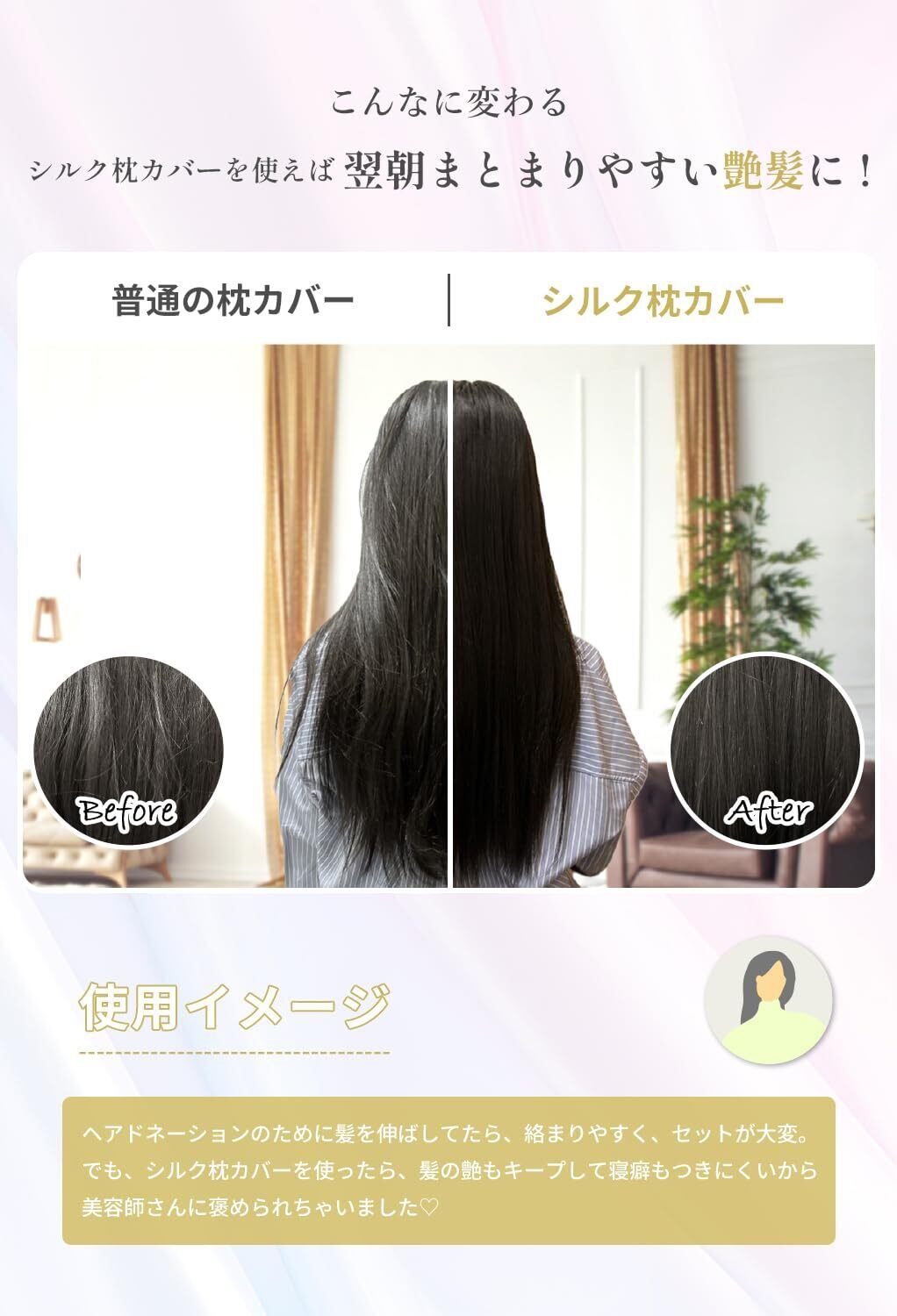 【美髪効果・睡眠中のヘアケア】シルク100%の枕カバーで、シルクに含まれるタンパク質は、枝毛・縮毛・曲がり・乾燥を最小限に抑え、髪と髪の摩擦を平均45%減らす効果があります。シルク枕カバーは長く使っていくうちに、髪が段々柔らかく滑らかになって光沢がでてきたりと髪質改善を実感できます。髪のキューティクルを守り、つや髪を喚起するだけでなく、頭皮と顔面の皮膚環境を整えることができ、睡眠中のビューティーグッズとして重宝されています。