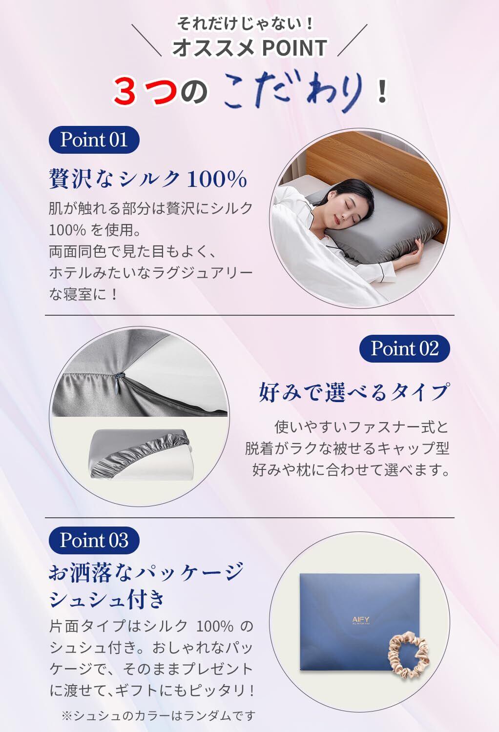 【希少な6Aランクシルク枕カバー】AIFY シルク枕カバーは、片面に希少な6 Aランクのシルクを採用し、もう片面にシルクのような滑らかなサテンを採用しています。シルク枕カバー独特の光沢感で高級感のある一品。100%純粋なマルベリーシルクのなかでも、高品質な6Aランク&19匁の厚みのある生地を厳選しております。天然タンパク質と人肌に極めて近いアミノ酸成分を含んでいるため、敏感な肌の人や赤ちゃん、ご高齢の方でも快適にご利用いただけます。