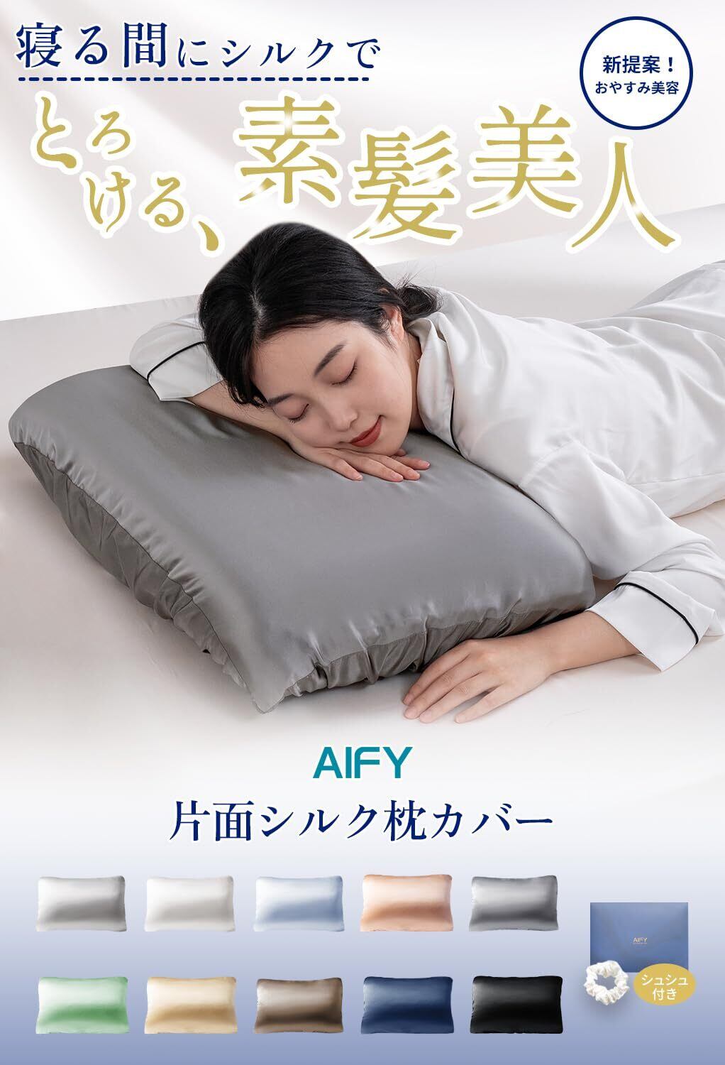 AIFY シルク枕カバー 【TVで紹介】 片面100%シルク 6Aクラス 枕カバー 美髪 美肌 髪の毛のダメージ減少 サラサラ ひんやり 保湿 通気性 洗える 敏感肌に優しい 抗菌防臭 静電気防止 摩擦軽減 キャップ型 1枚セット 43×63cm グレー