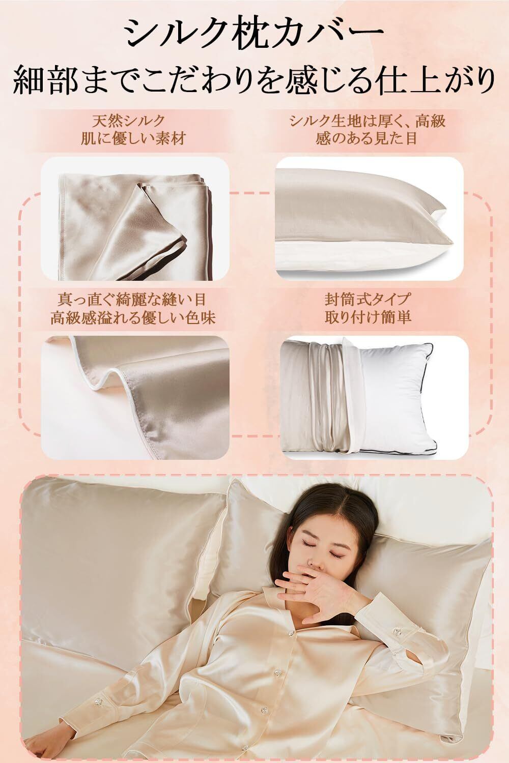 Utukky シルク枕カバー【TVで紹介】まくらカバー 片面シルク枕カバー 43×63cm 封筒式枕カバー シルクピローケース テンセル 洗える 寝癖軽減 抗菌防臭 美髪・美肌 敏感肌に優しい 四季適応 クリスマス 新年ギフト 贈り物 1枚セット シャンパン