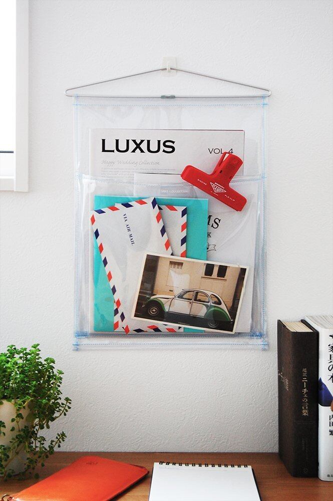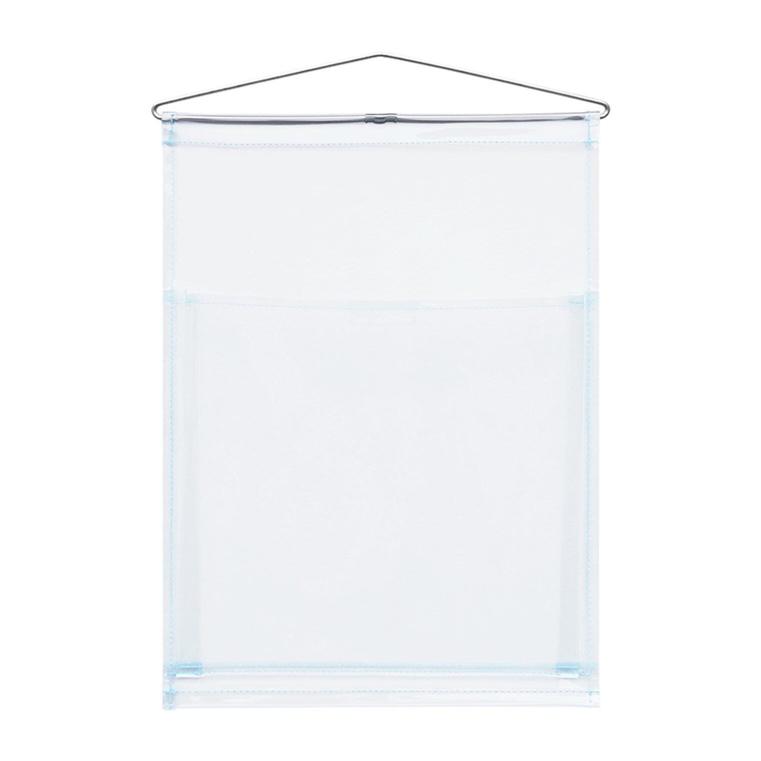 ポケットは1個。A4サイズのパンフレットがタテに入るサイズ。仕切りなしなので、ポンポンといろいろ入れるには最適。厚みのあるしっかりしたビニールを使っています。クリアーな透明。ビニール素材。横幅約27.5cm高さ約37.5cm ポケット1つの大きさは横約25.5cm縦約24cm、三角形のスチール金具付き、フックなどに掛けてお使いください。