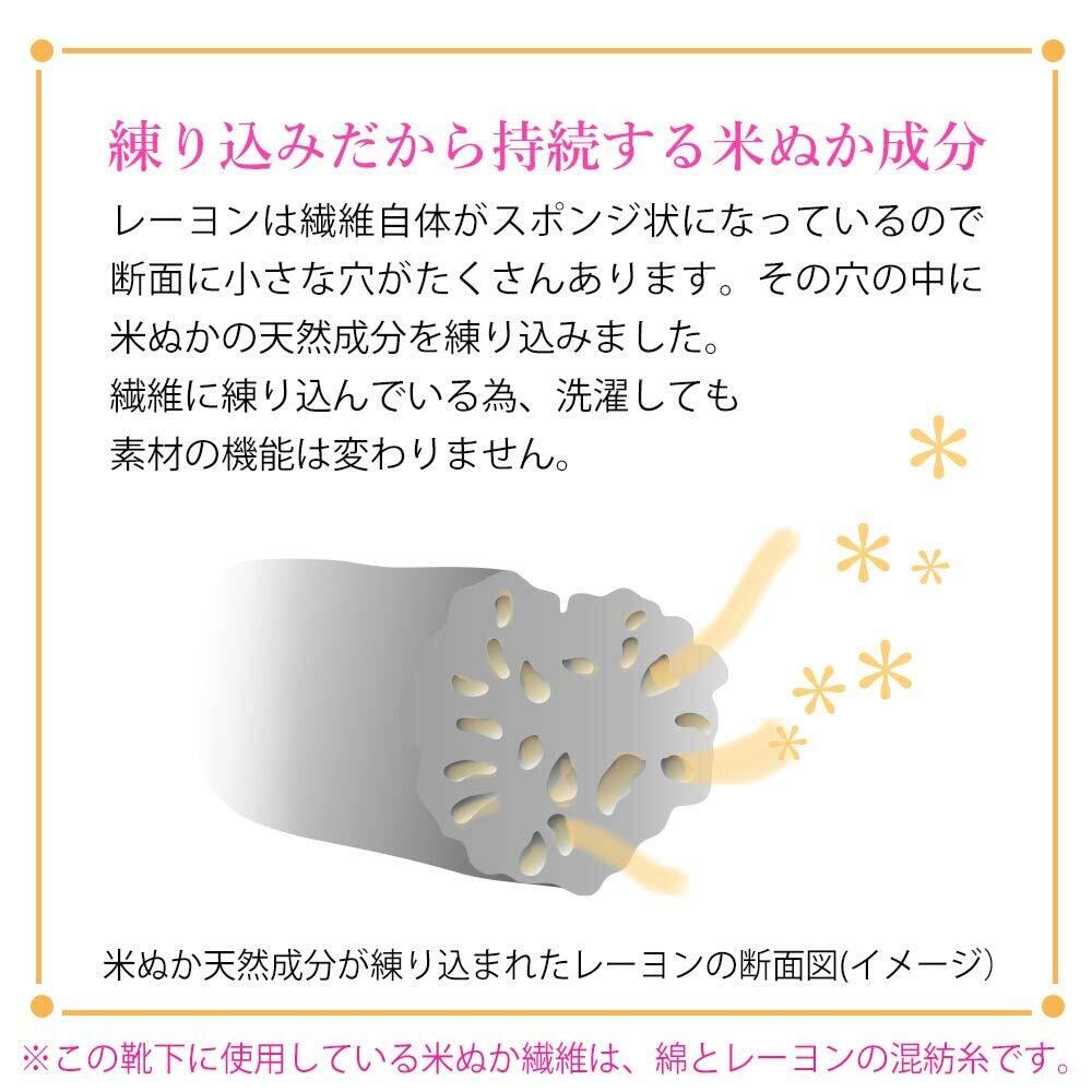 【履くだけで、手間なく簡単にかかとケア】繊維に米ぬか天然由来成分(米ぬかオイル、γ-オリザノール、 フェルラ酸)が練りこまれており、γ-オリザノールとフェルラ酸を更に増強して練りこみました。お肌のバリア機能をやさしくサポート(保湿)します。 特に荒れやすいかかとには、「米ぬかシリコン」をプリント加工しています。