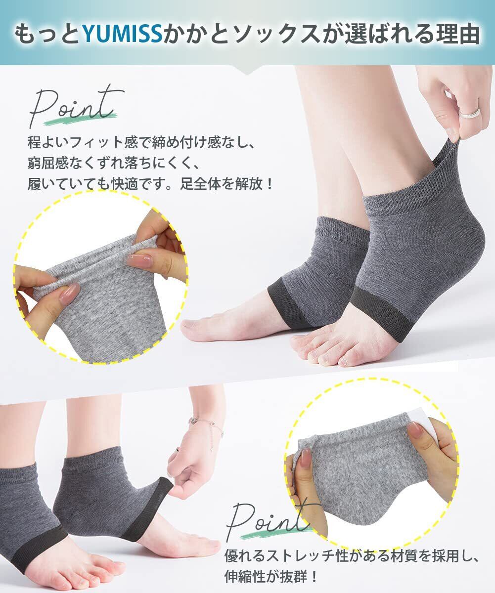 【歩く時の痛みを緩和、着用時の異物感なし】 YUMISSのかかとケア靴下はかかとの亀裂による歩くのが痛い方におすすめになります。歩行時のかかとへの衝撃を吸収し痛みを緩和することができます。シリカゲル保湿ジェルの厚さは0.8mmしかなく、生地は柔らかい。足に履いても何の負担も異物感もなし、着心地が良いです。