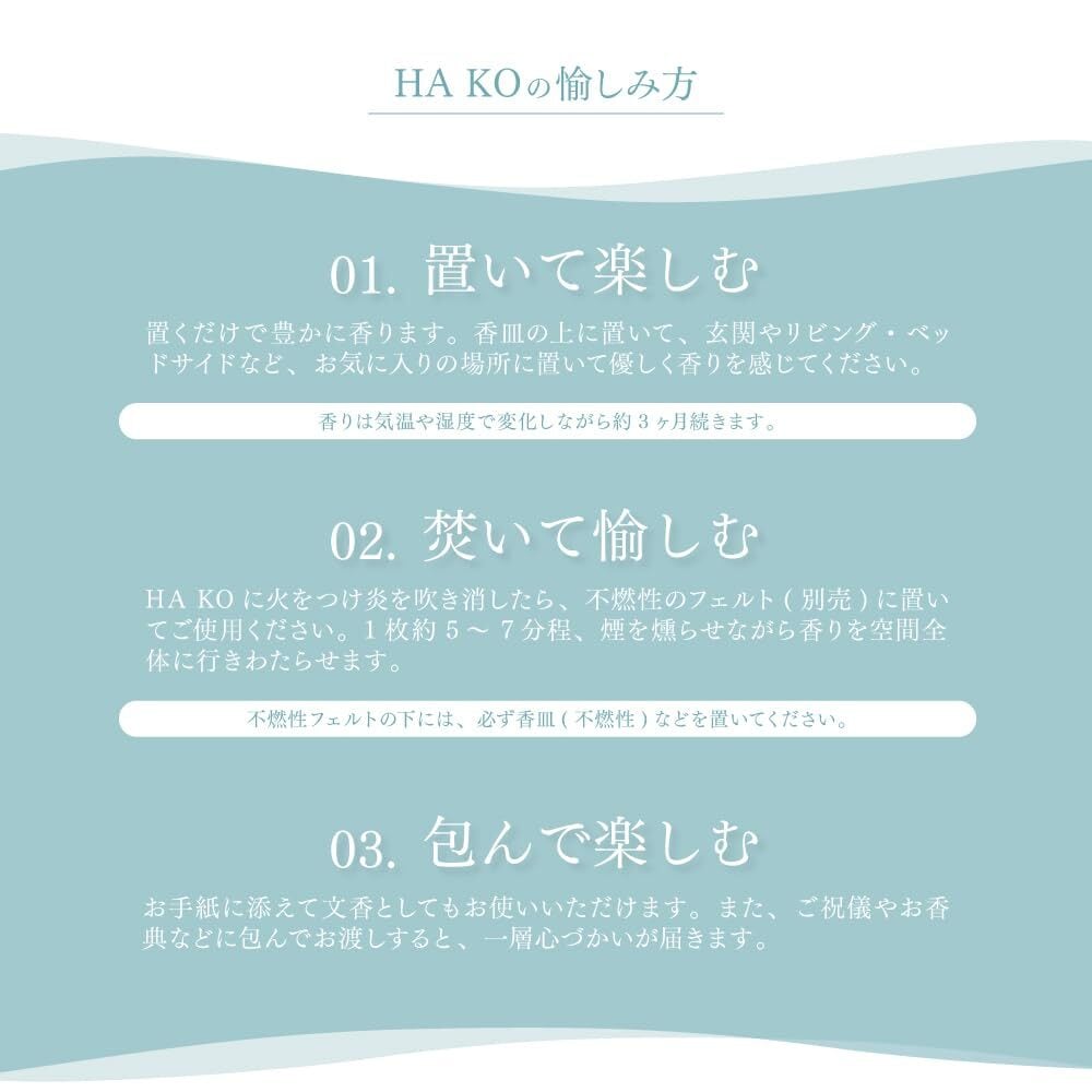 【HA KOの楽しみ方】01.置いて楽しむ(香皿の上に置いて、玄関やリビング・ベッドサイドなど、お気に入りの場所に置いて優しく香りを感じてください)/02.焚いて愉しむ(1枚5~7分程、煙を燻らせながら香りを空間全体に行きわたらせます)/03.包んで楽しむ(お手紙やご祝儀やお香典などに包んで文香として)