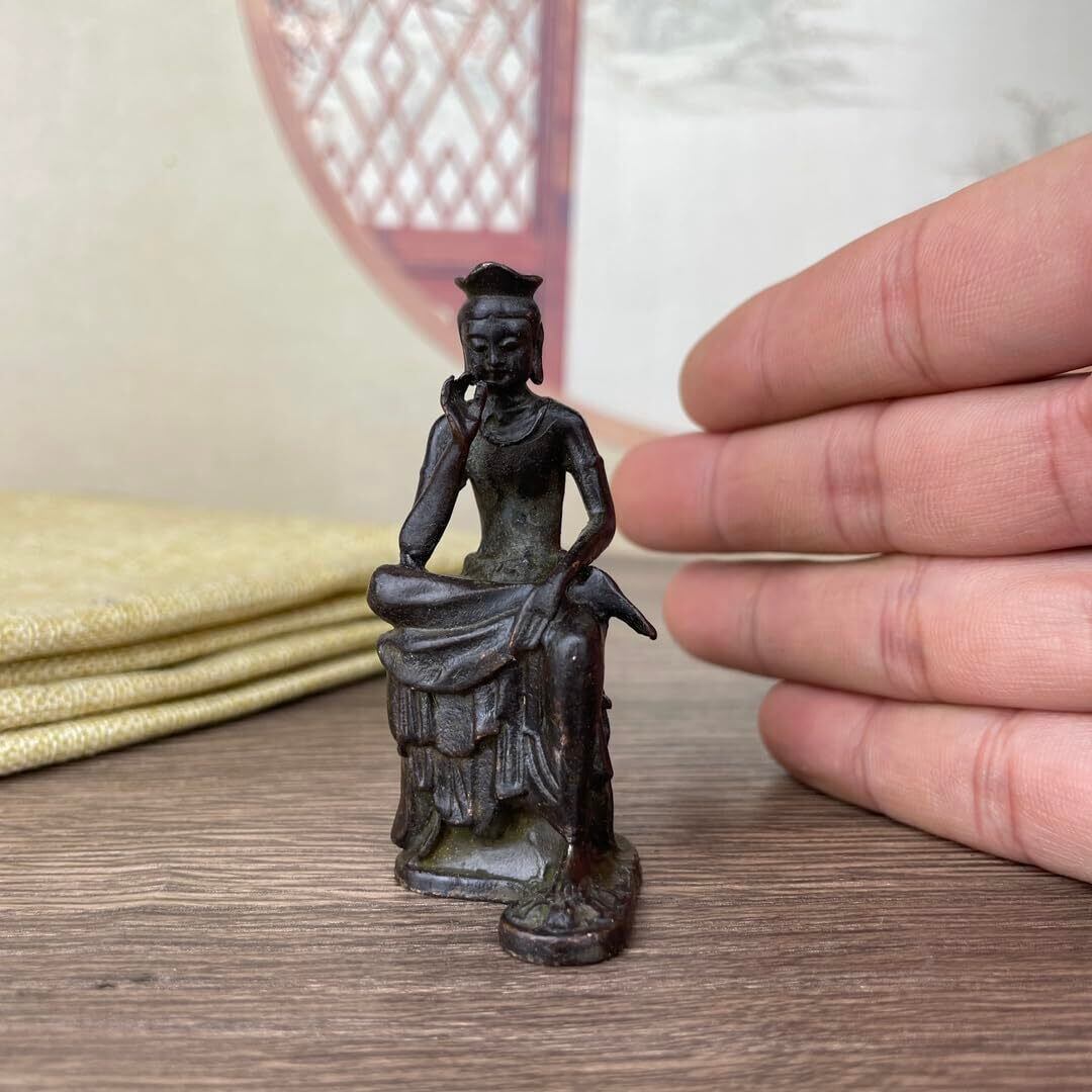 右手の指を頬に当て、物思いにふける弥勒の半跏思惟像。 こちらは金属製の鋳造仏です。趣きあるインテリアとして、また心のよりどころとして、日々の暮らしの中でお楽しみ頂けるサイズとなります。