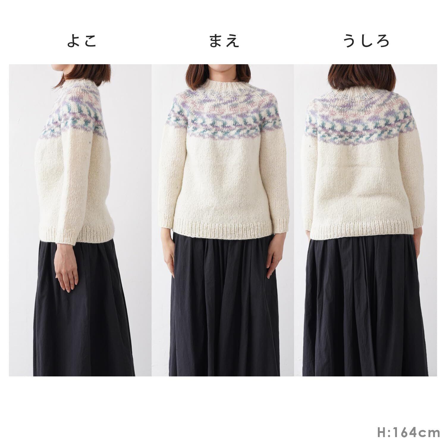 用意するもの:みんなのセーター(300g玉巻き)/…1玉 │ 輪針60cm(8mm)、輪針40cm(8mm)、5本針25cm(15号)、かぎ針10/0号(袖下の別鎖用) │ その他材料:別糸(極太程度)約50cm(袖下の別鎖用)