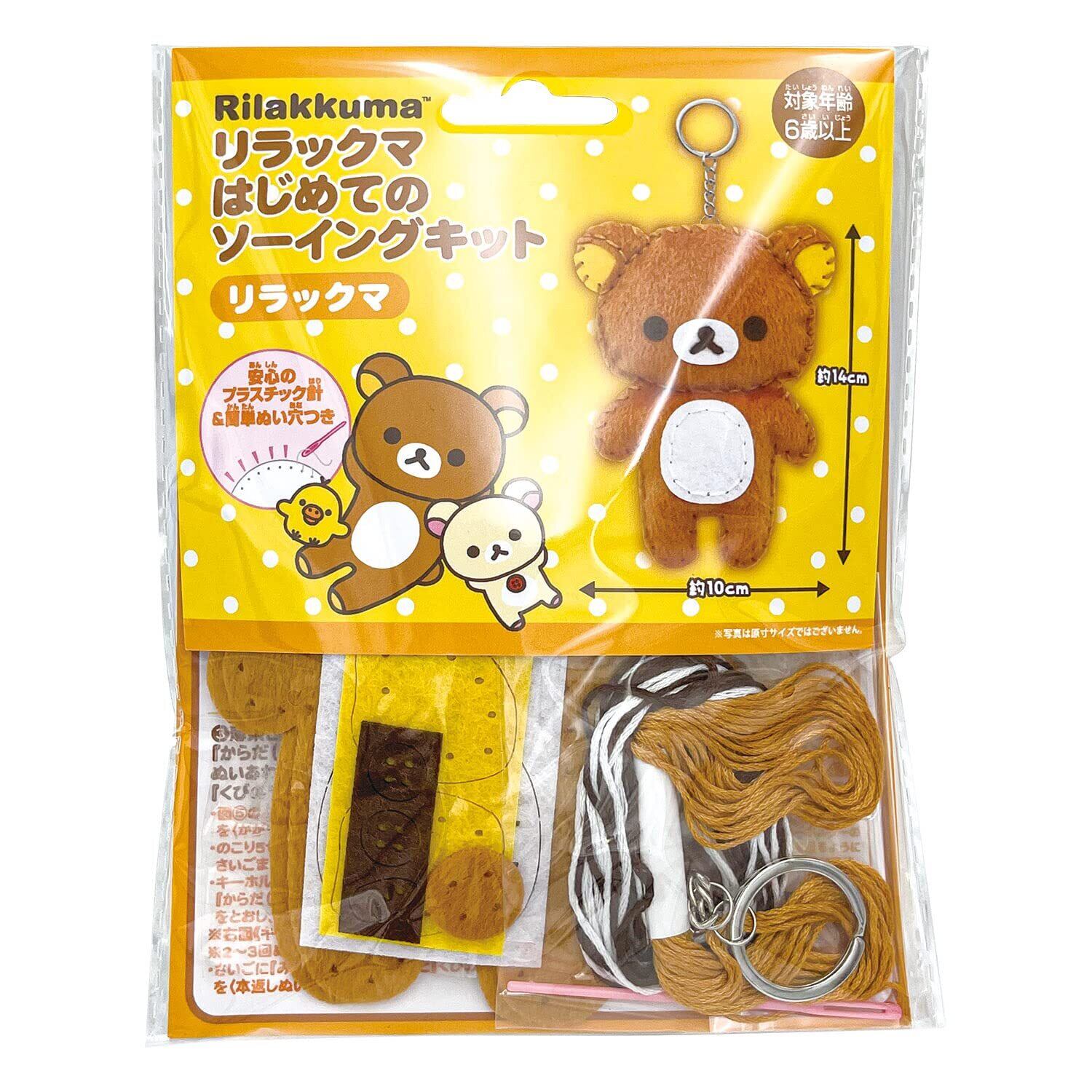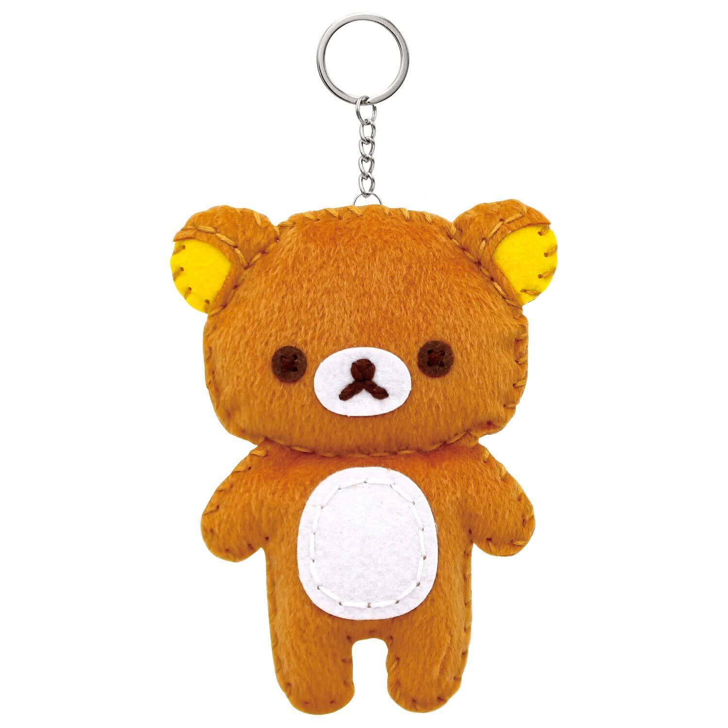リラックマ の マスコット が作れる ソーイング キット ! 付属の プラスチック 針 と 糸 を使って、順番通りに 布 を縫い合わせて最後に 綿 を詰めると マスコット キーホルダー が作れます。