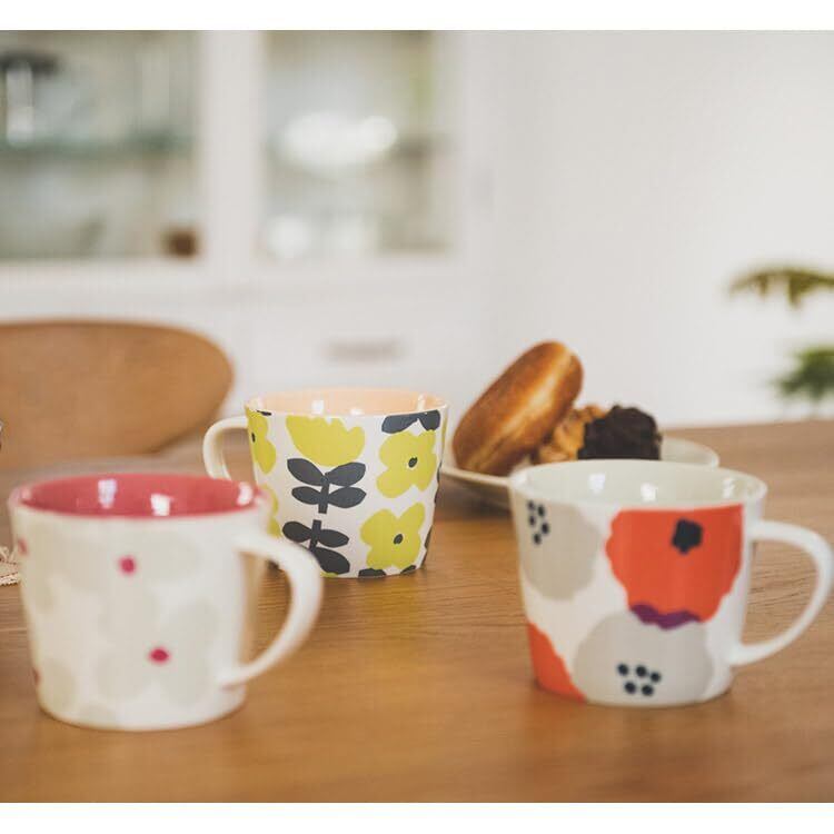柄に合わせて内側カラーも異なっており、食器棚に並ぶ姿もかわいいマグカップです。