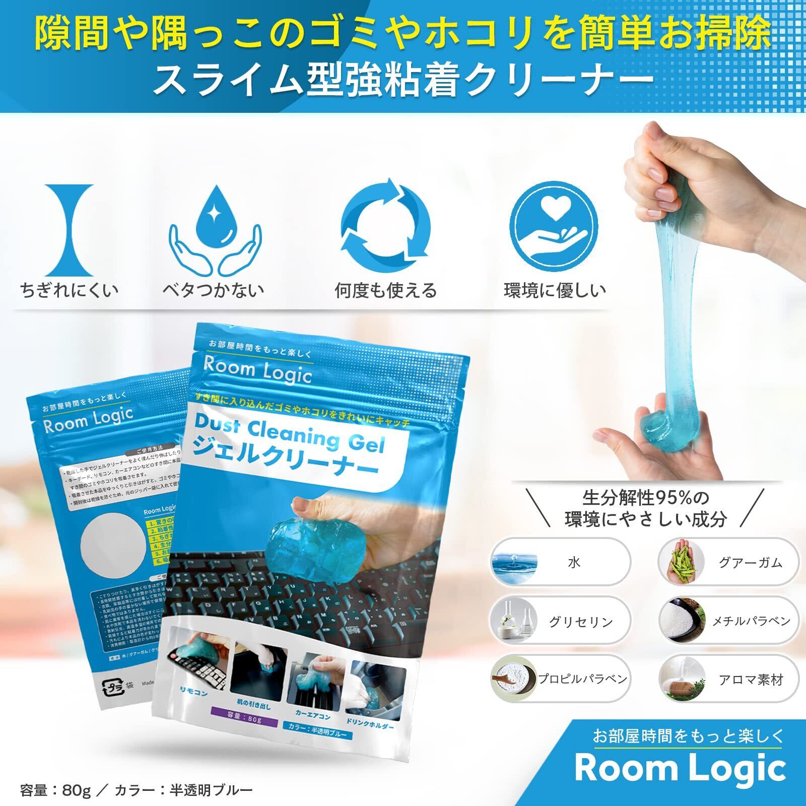 ジェルクリーナー キーボード 車内 掃除 スライム 強吸着 ゴミ ホコリ 繰り返し使える (80g×3袋)