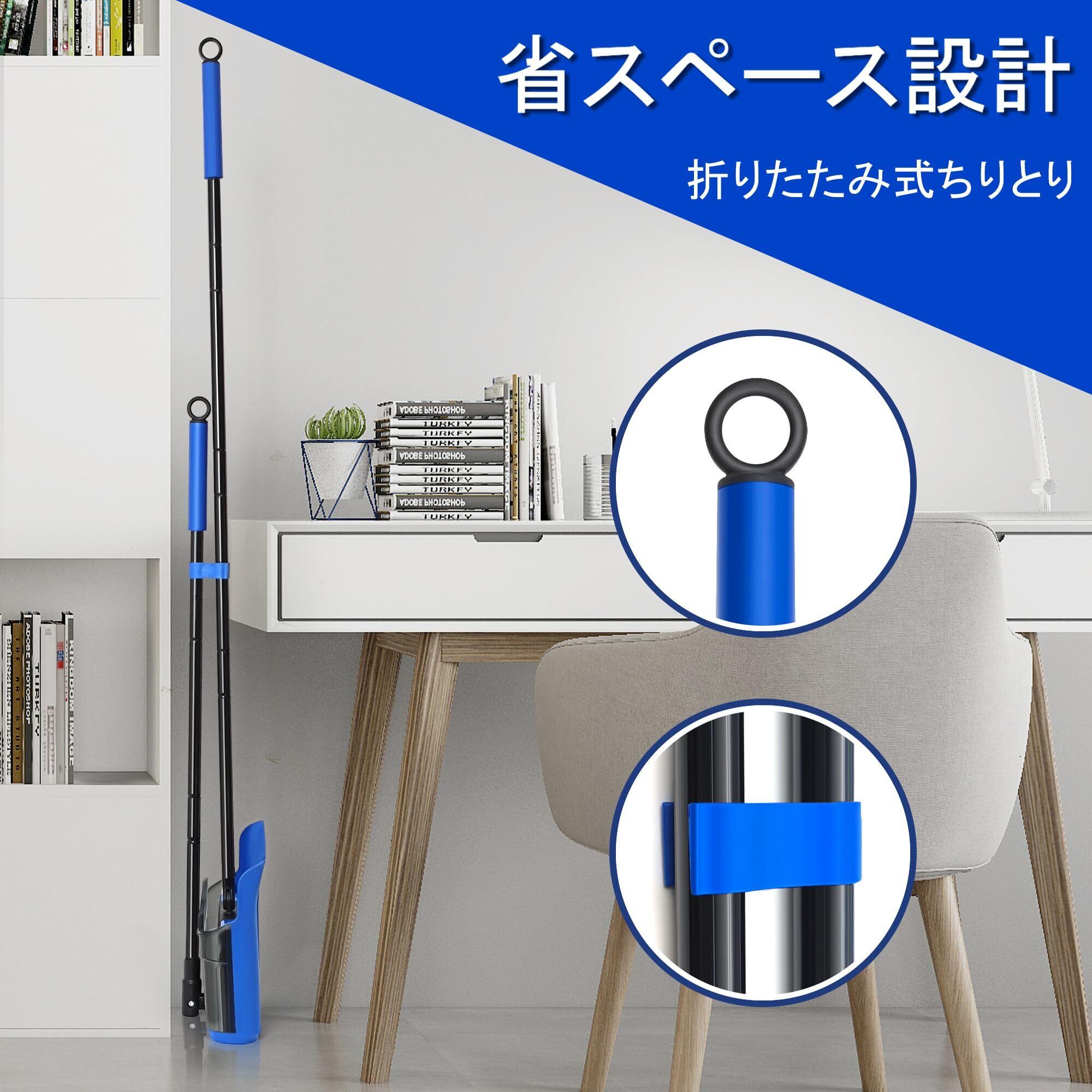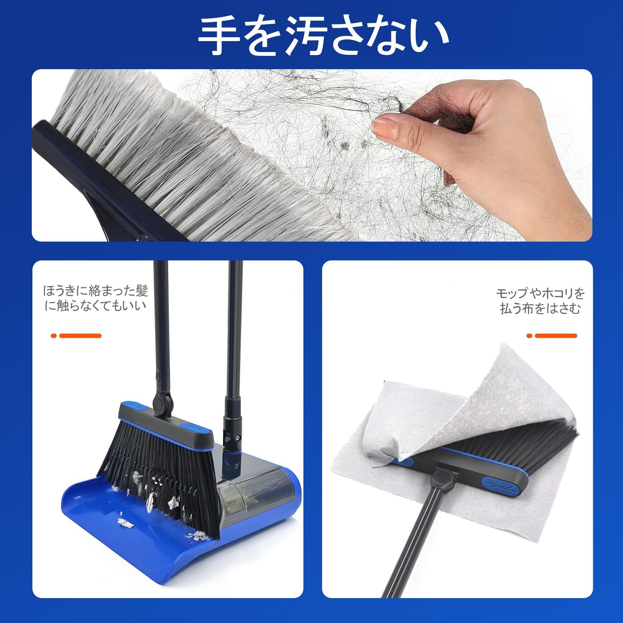 ほうき ちりとり:ほうきヘッドの2つのスナップは、窓拭き、モップ掛け、掃き掃除などの不織布と連動します。また、180度回転するヘッドで、ベッドやテーブルの下など、目隠しになる場所の掃除も簡単です。