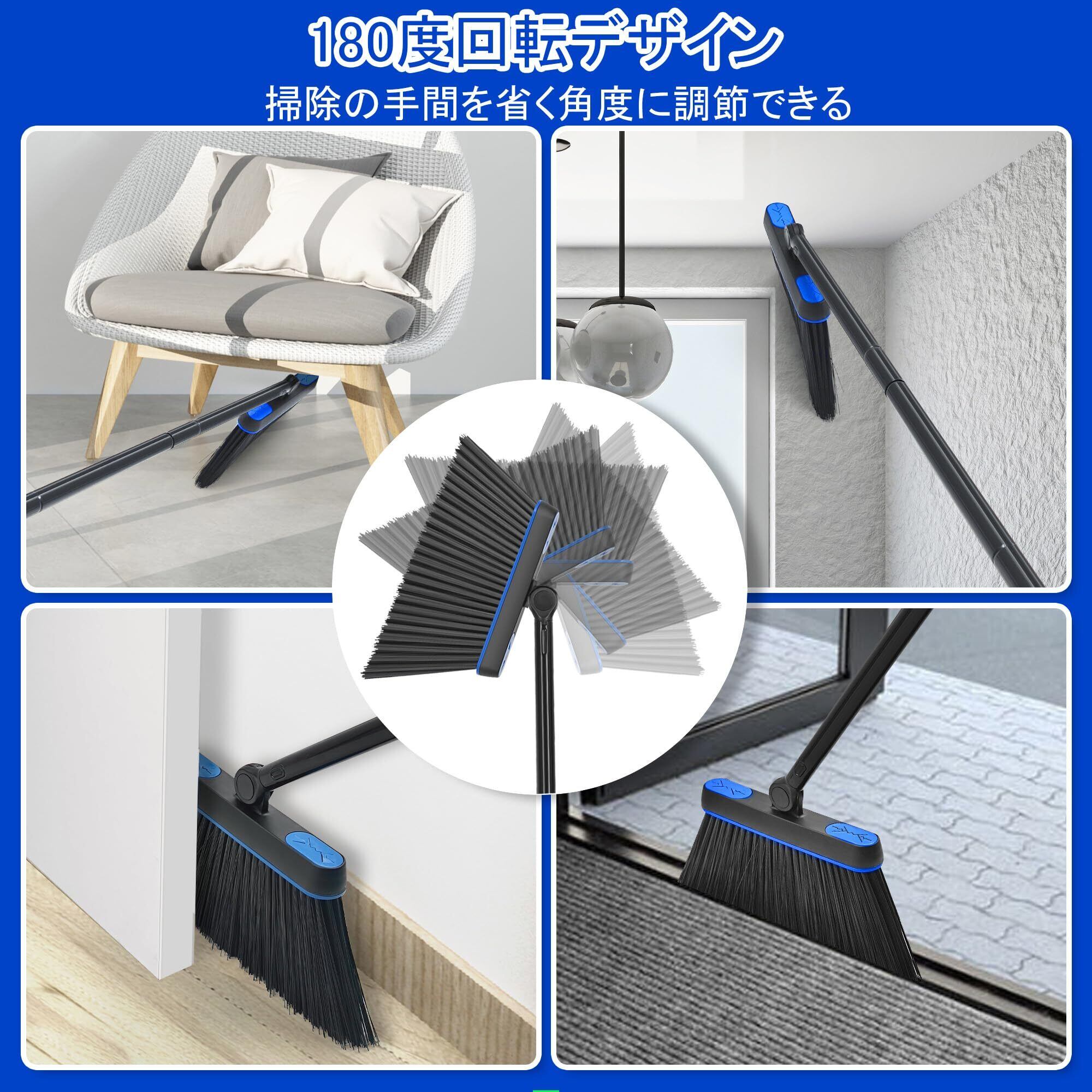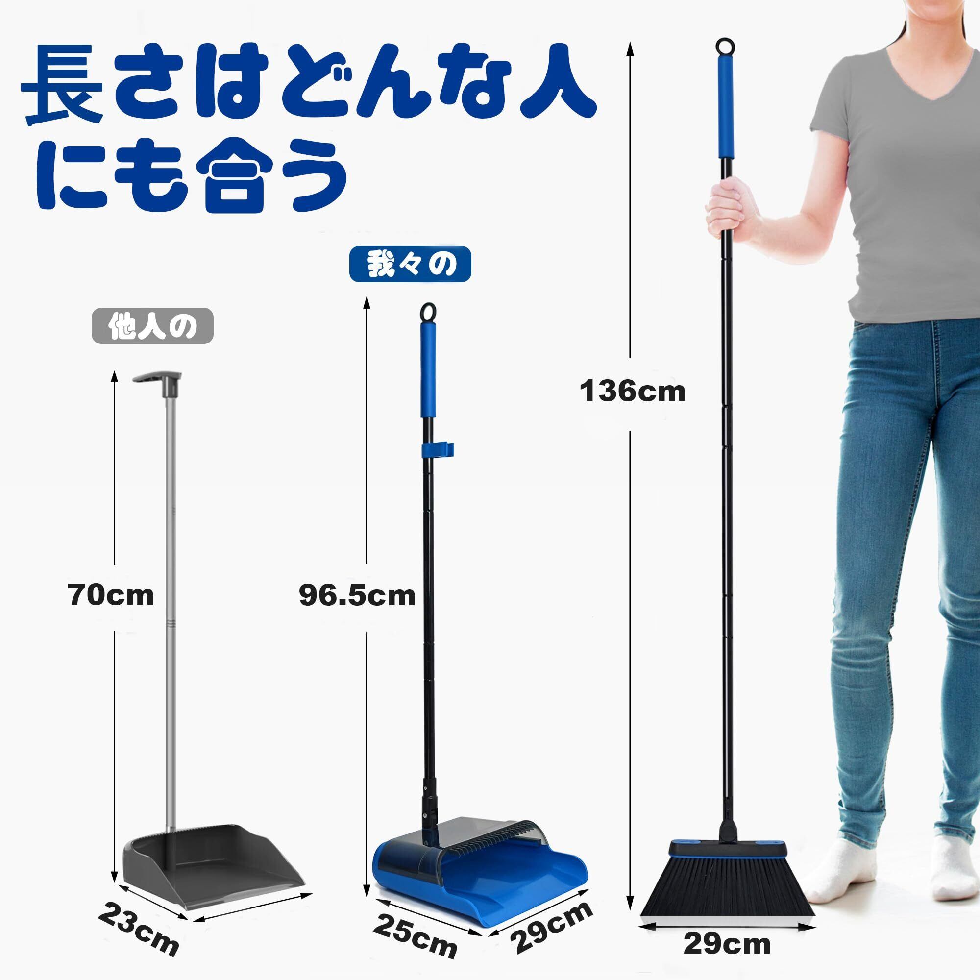 JEHONNほうき ちりとり セット室内 屋外, 136cmロングハンドルホウキ ちりとり セット軽量180度回転自立掃除道具, 防風塵取り室内玄関ホーム庭園ショッガーデニング(青)