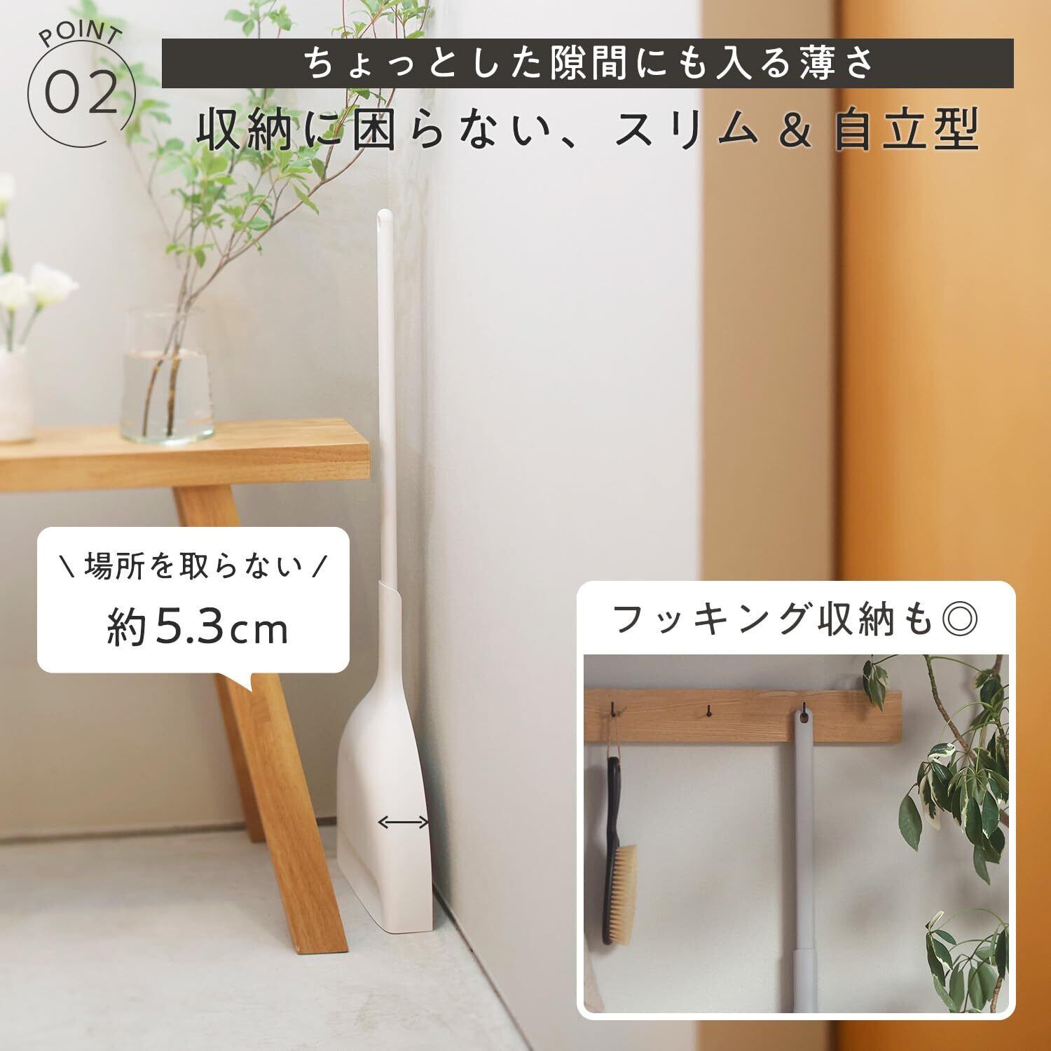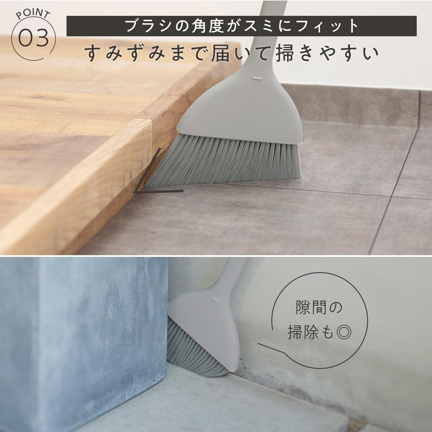 【掃除しやすい角度】ブラシ部分は角度をつけているので、隙間や溝のゴミも掃きとれます。また、ちりとりは段差がついており、ゴミが逆流しにくい形状です。薄い楕円のグリップで、しっかり握って掃除ができます。