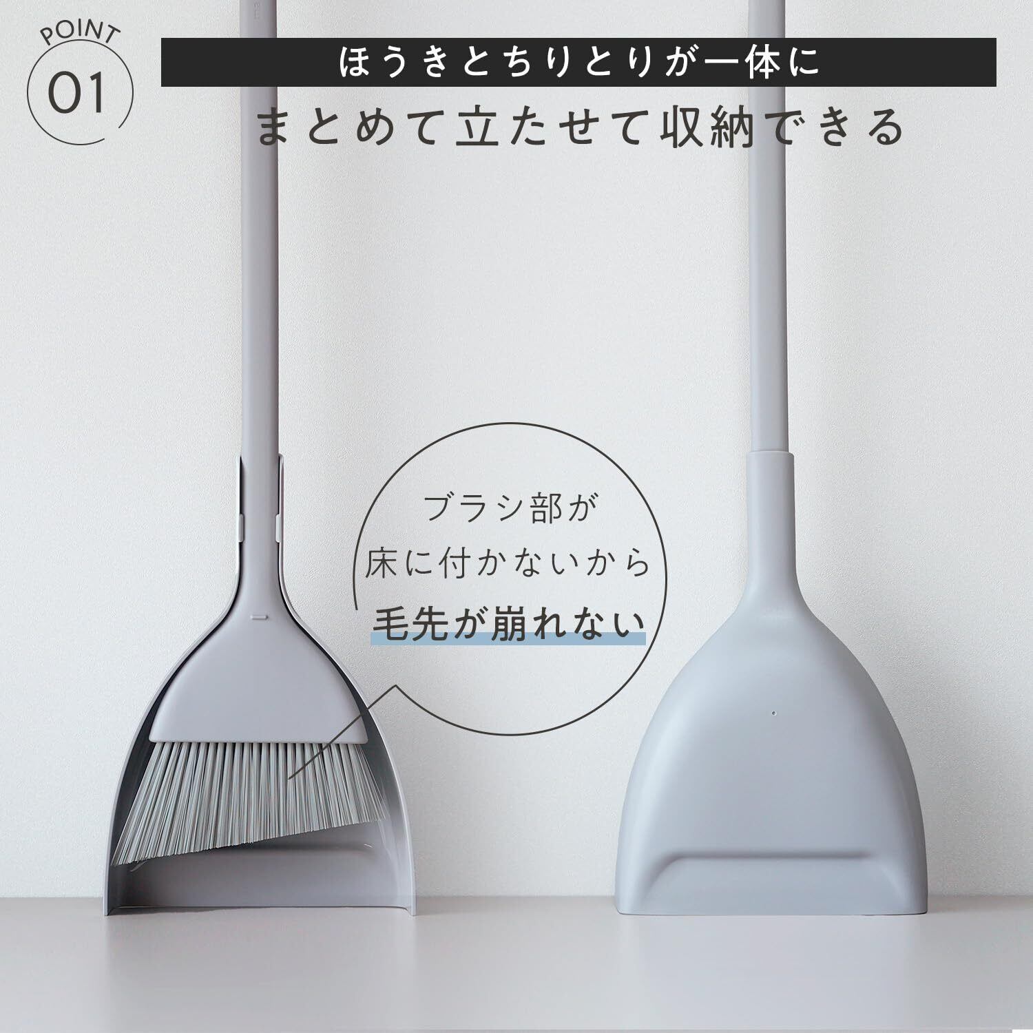 【掃きやすく、立たせてすっきり収納】掃きやすいほうきと、ゴミがこぼれにくいちりとりのセットです。立たせてすっきり収納できます。