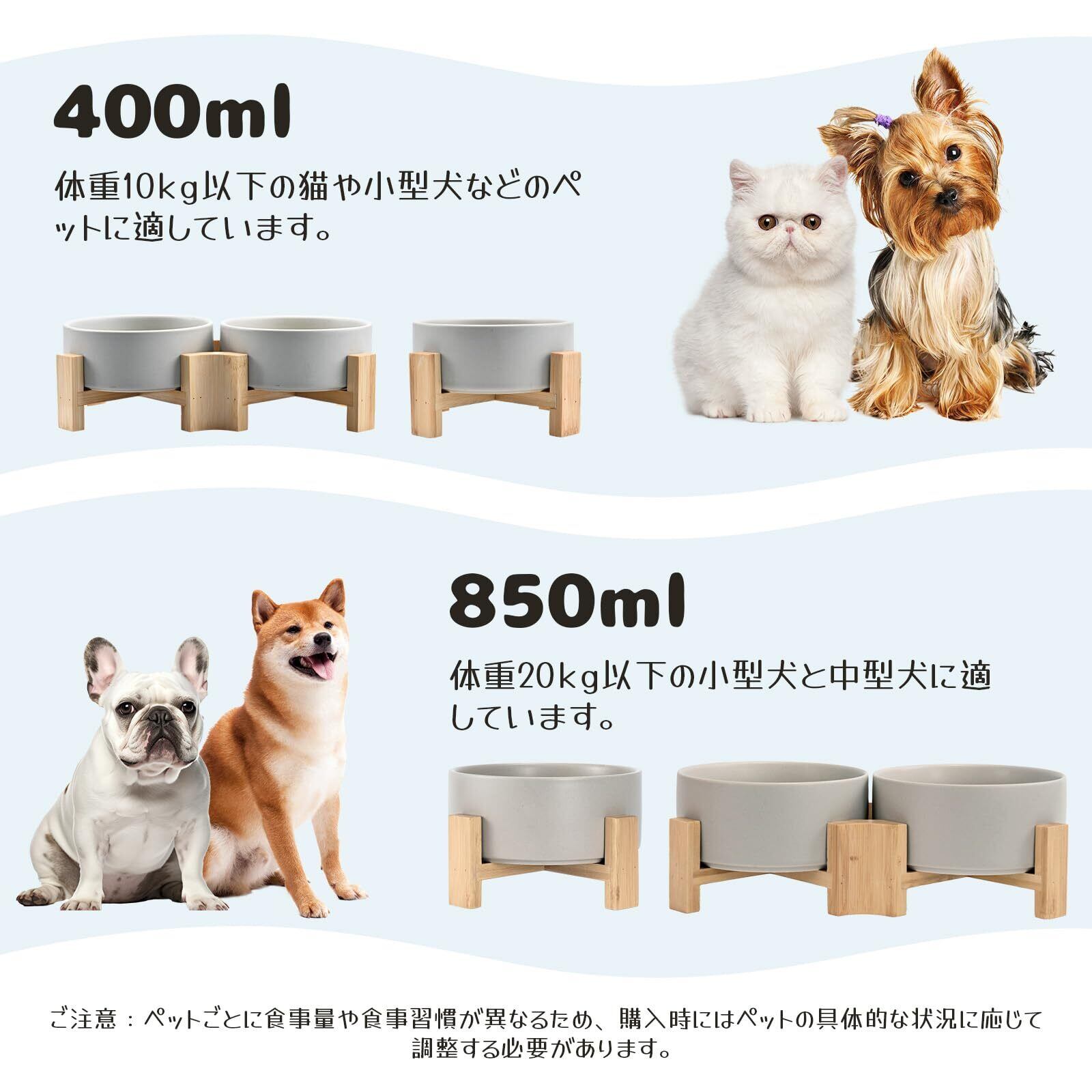 製品容量:1個あたり400ml(ボウルを水平に置いたときの容量)。10kg未満の猫、子犬、小型犬に適しています。(注意:ペットごとに食事量や食習慣が異なるため、実際の状況に応じて適切な製品を選んでください。)