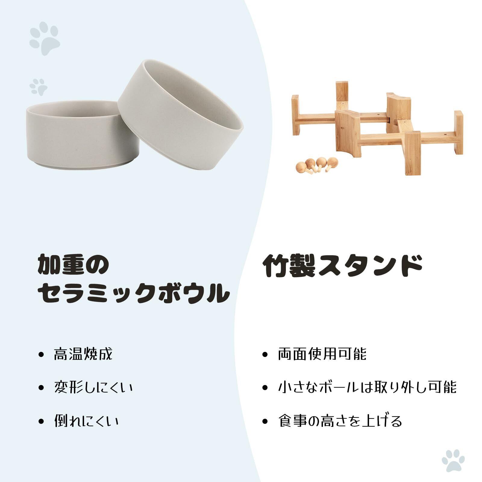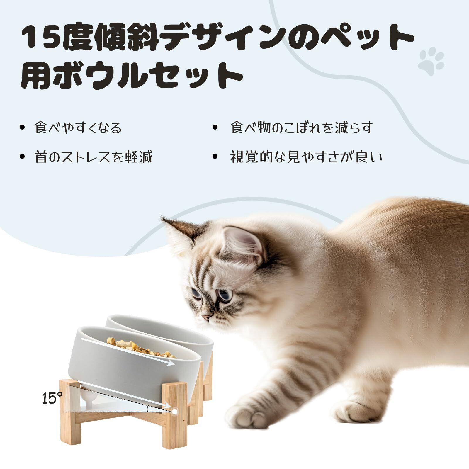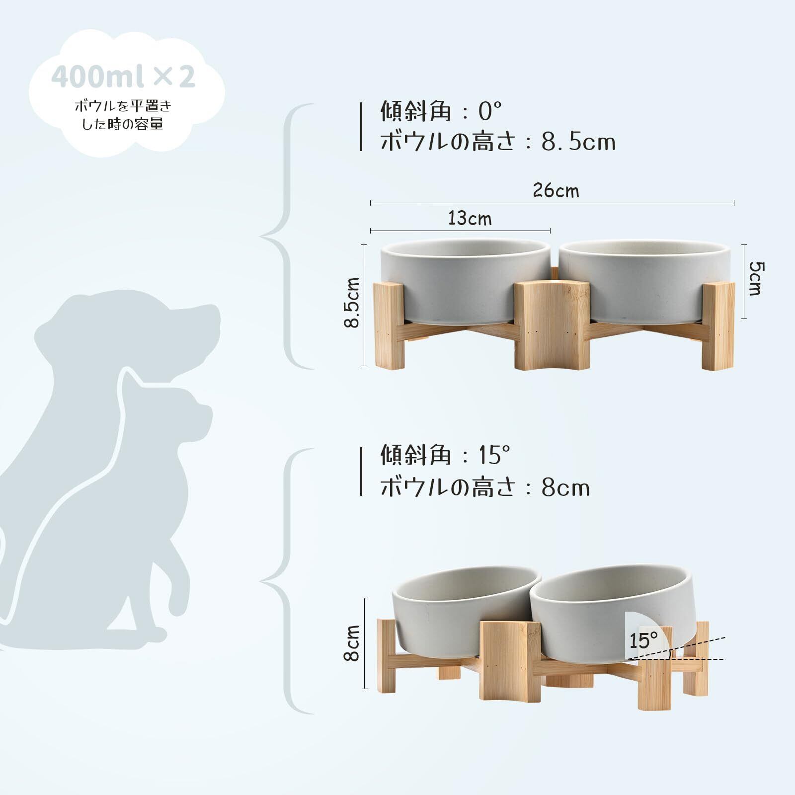 犬 餌入れ ボウル 15度 斜め 陶器 猫 えさ 皿 ペット 食器 水入れ 木製 ボウルスタンド付 高さ調整可能 フードボウル 食べやすい 小型犬 400ml グレー