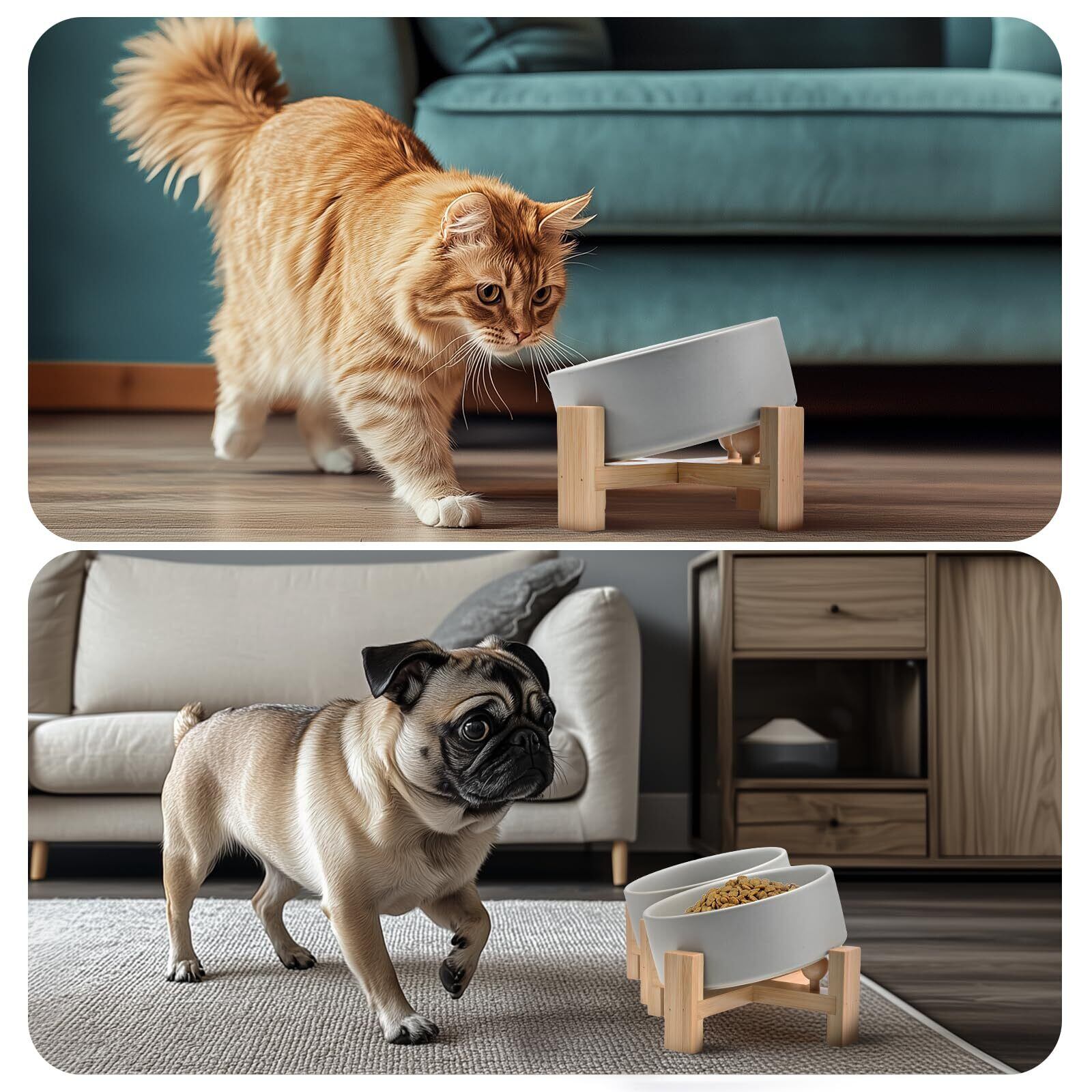【安全なセラミック素材】猫と犬用ボウルセットは、高温で焼成された陶磁器のボウルと竹製のスタンドで構成されており、適度な重量と安定性があり、ペットが食事中に簡単には倒れません。ペットに健康的な食事環境を提供します。