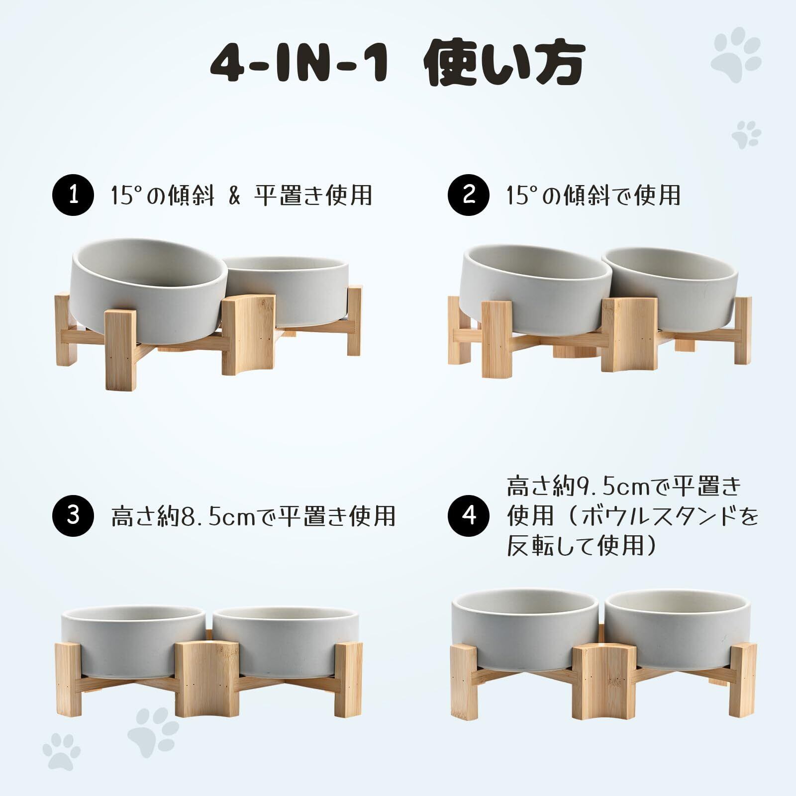 【4つの使い方】FeedFurryペットボウルの木製スタンドは多機能設計になっており、取り外し可能なサポートボールと組み合わせることで、ペットボウルを15度傾斜させて使用できます。スタンドの片側のボールを取り外すと、ボウルを傾斜と水平の両方の状態で使用できます。スタンドのすべてのボールを取り外すと、2つのボウルが水平に配置されます。スタンドを逆さまにすると、高さ9.5cmの水平ボウルセットになります。4つの使用方法により、ペットにさまざまな食事の選択肢を提供します。(ご注意:スタンドの小さいボールは、使用しないときはペットが触れない場所に置いてください。)