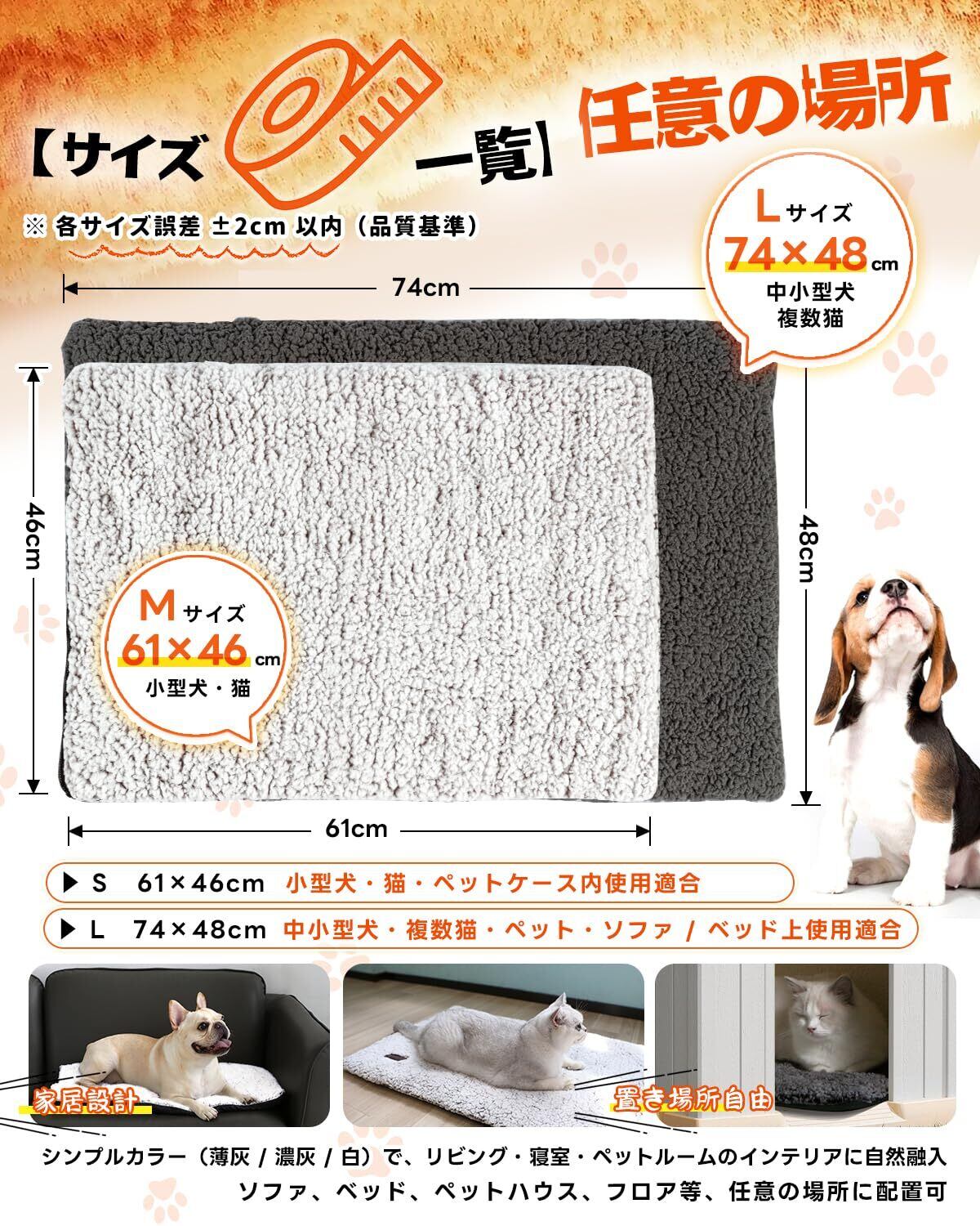より多くの選択肢を満たす:S サイズ(61×46cm)は猫や小型ティアップ向けの猫用保温マット・猫用自熱マット、M サイズ(74×48cm)はチワワ・ポメラニア・シーズーなど小型犬。カラーはライトグレー、ダークグレー、ホワイトの 3 色から選べます。どの色もご自宅のインテリアと調和し、冬場の防寒にも役立つ多機能ペットマットとして、機能性と美的感覚を両立させた一品です。