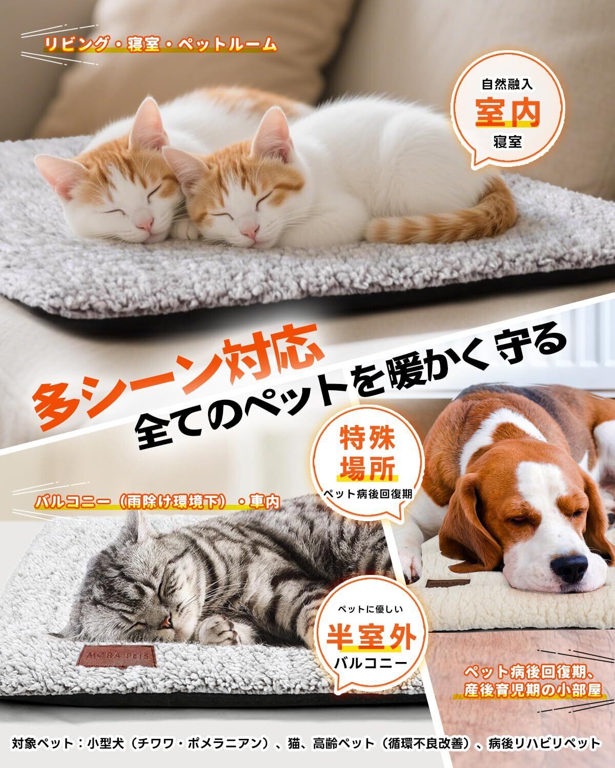 室内外で便利に使用:耐候性に優れた設計で、玄関やベランダ、ガレージ、室外の猫小屋はもちろん、お部屋のソファやクレートの中、ペットベッドの上など、さまざまなシーンで活躍します。ペットの過ごす場所を選ばず、暖かなスポットを作ります。