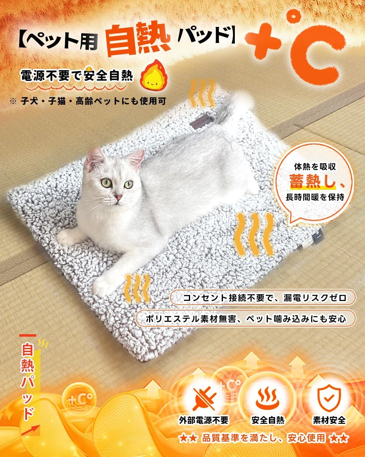 ペットあったかマット【電気不要】:ペット用保温マットは、コードや電池を一切使わないから、感電のリスクがなく、室内外を問わずずっと安心してお使いいただけます。その温かさのヒミツは、特殊な素材がペット自身の体温を効率よく反射し、優しい保温効果を生み出す仕組み。ペットの体に寄り添う、自然な温もりを実現しました。