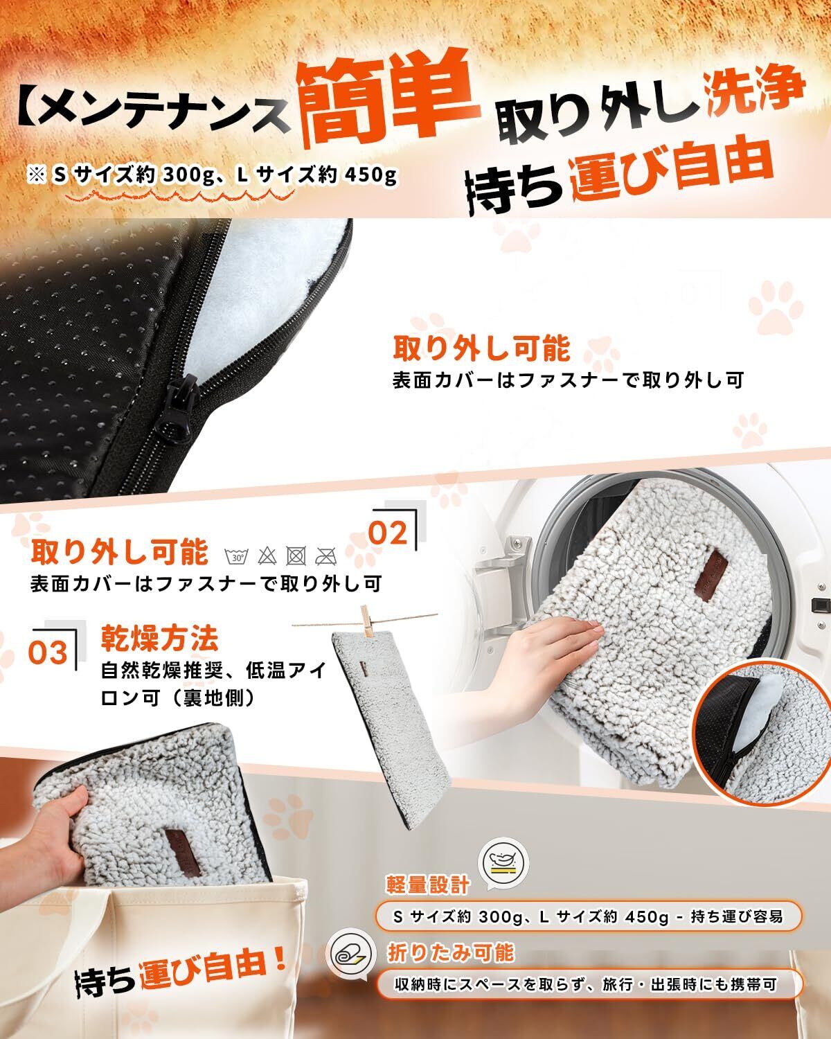 極細炭素繊維ペットホットマット:独自の繊維を採用し、保温性能が通常のペットマットの1.5倍!ふわふわで柔らかい生地がペットの肉球を優しく包み込み、内部は静音素材を使用しているため、ペットが動いてもサラサラと不快な音が立てず、安眠を妨げません。