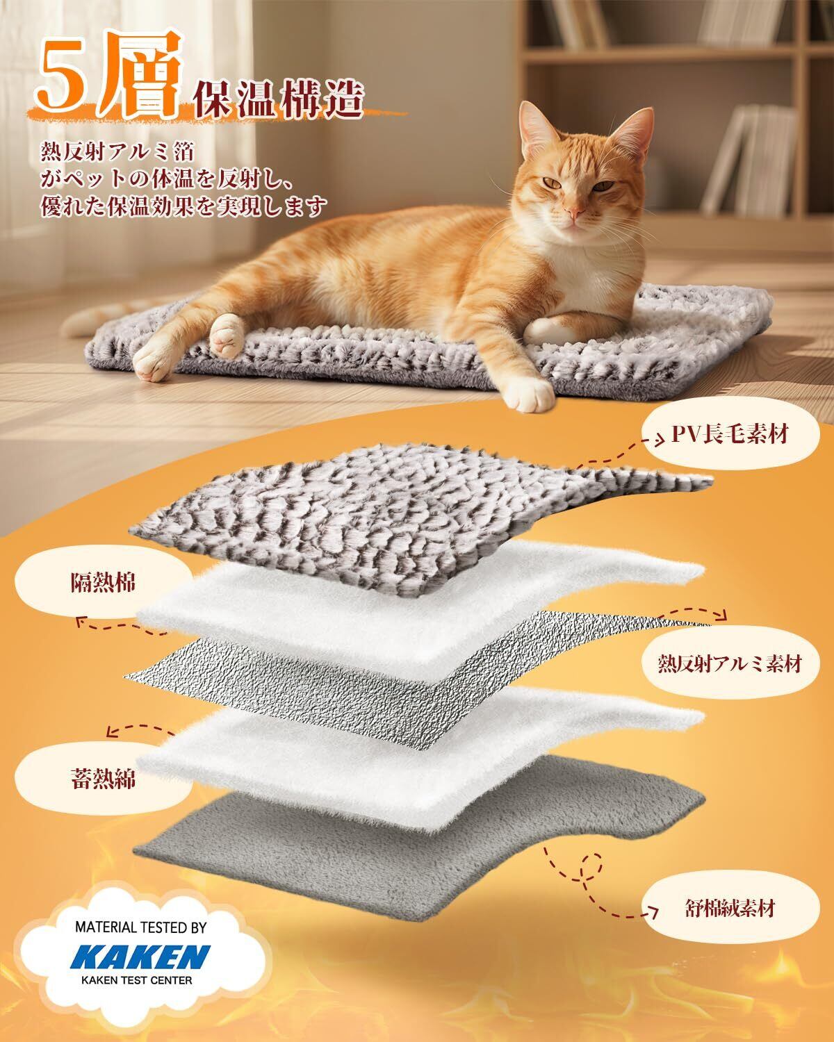 【電気不要】ペット自身の体温を効率よく反射し、穏やかな温もりを保ちます。電気コードや電源が一切不要なので、感電のリスクがなく、室内外を問わず、安心してお使いいただけます。愛するペットのための、安全で心地よい保温環境をご提供します。