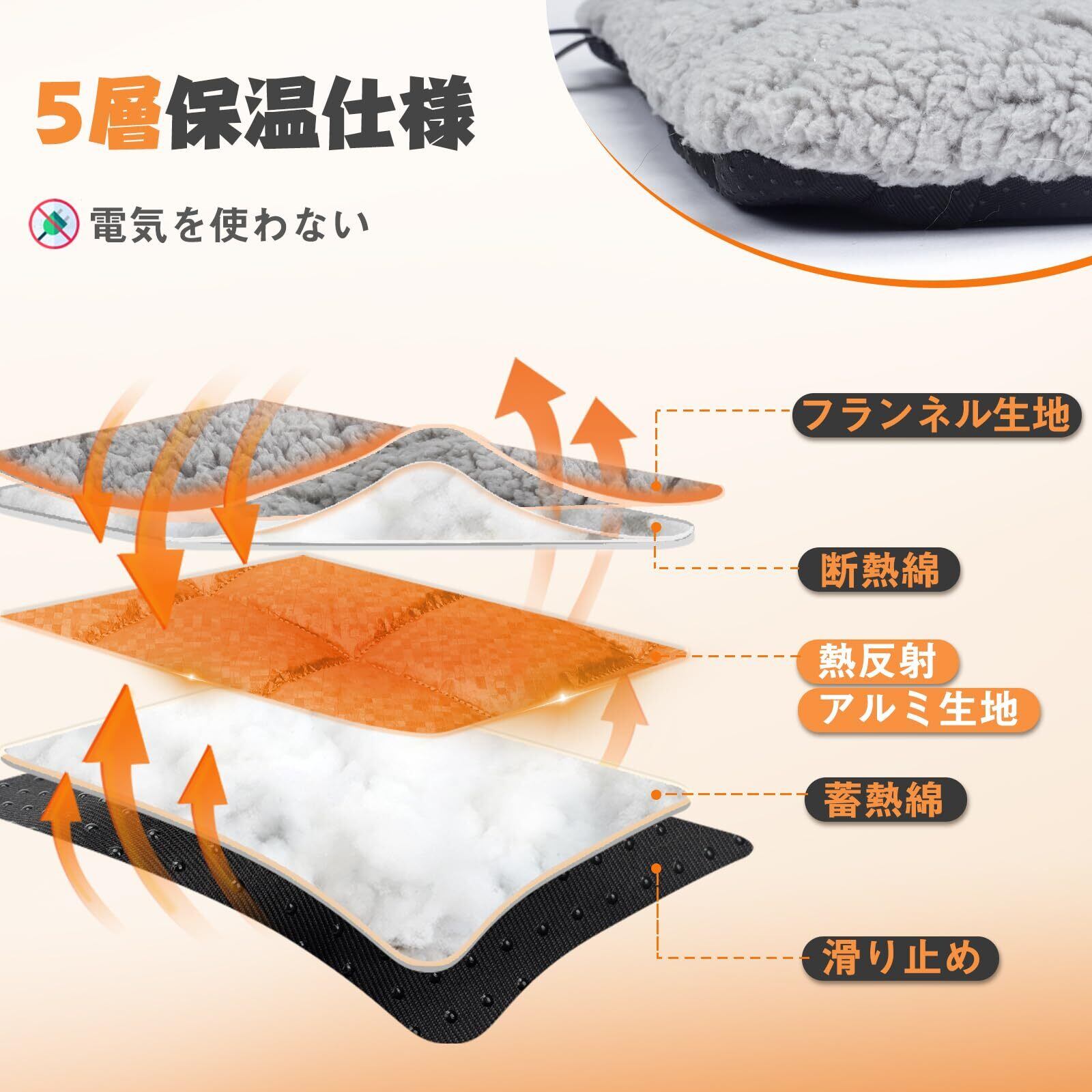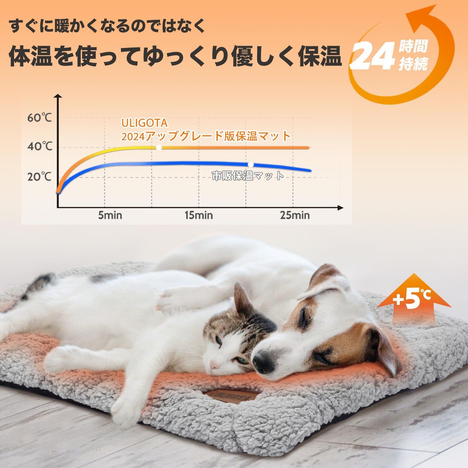 ペットの体温だけで表面温度が約+5度あがります。電気も使わず座るだけでじんわりと暖かくなるエコマットです。自身の体温で蓄熱の熱反射アルミ入りのマット。ほんのり温かさが持続します。ワンちゃん、ネコちゃんまかせで快適な温度を保つことができるので、電気代もかからなければ、コードをかじって感電する心配もない。元気いっぱいの子にも安心して使って頂ける保温マットです