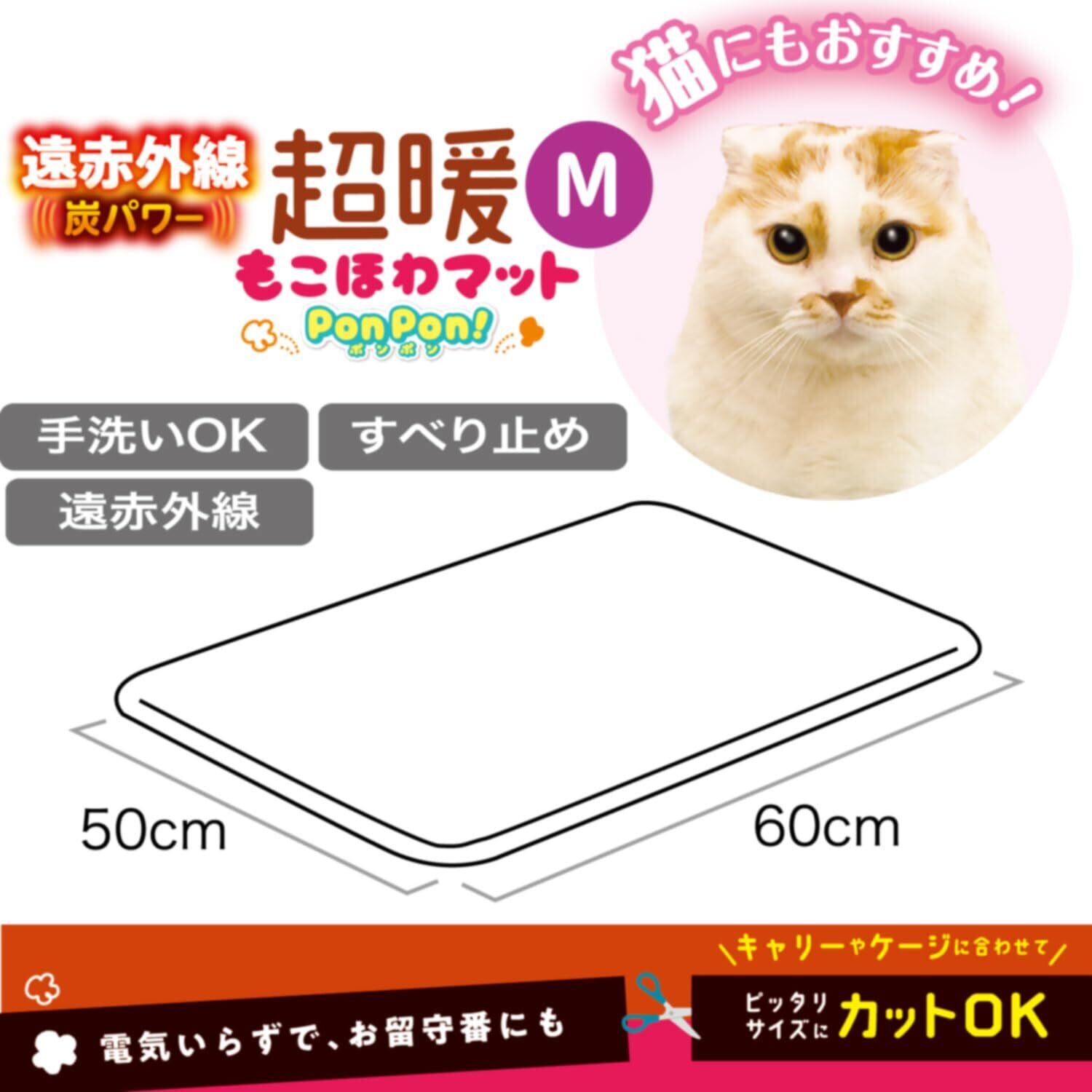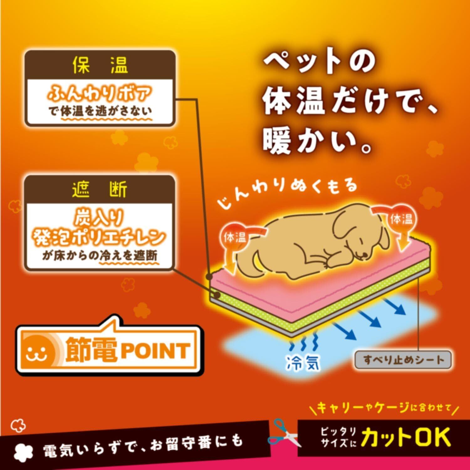 ●炭の遠赤外線とペットの体温だけで、じんわりぬくもる電気不使用のもこほわマット。●ふんわりボアが体温を逃がさず、炭入り発泡ポリエチレンが床からの冷えを遮断。●底面すべり止め付きで、フローリングでもズレにくい。●手洗いOK。汚れも臭いも洗い流せる。●サイズは約50×約60cm。ハサミでカットして使用できます。