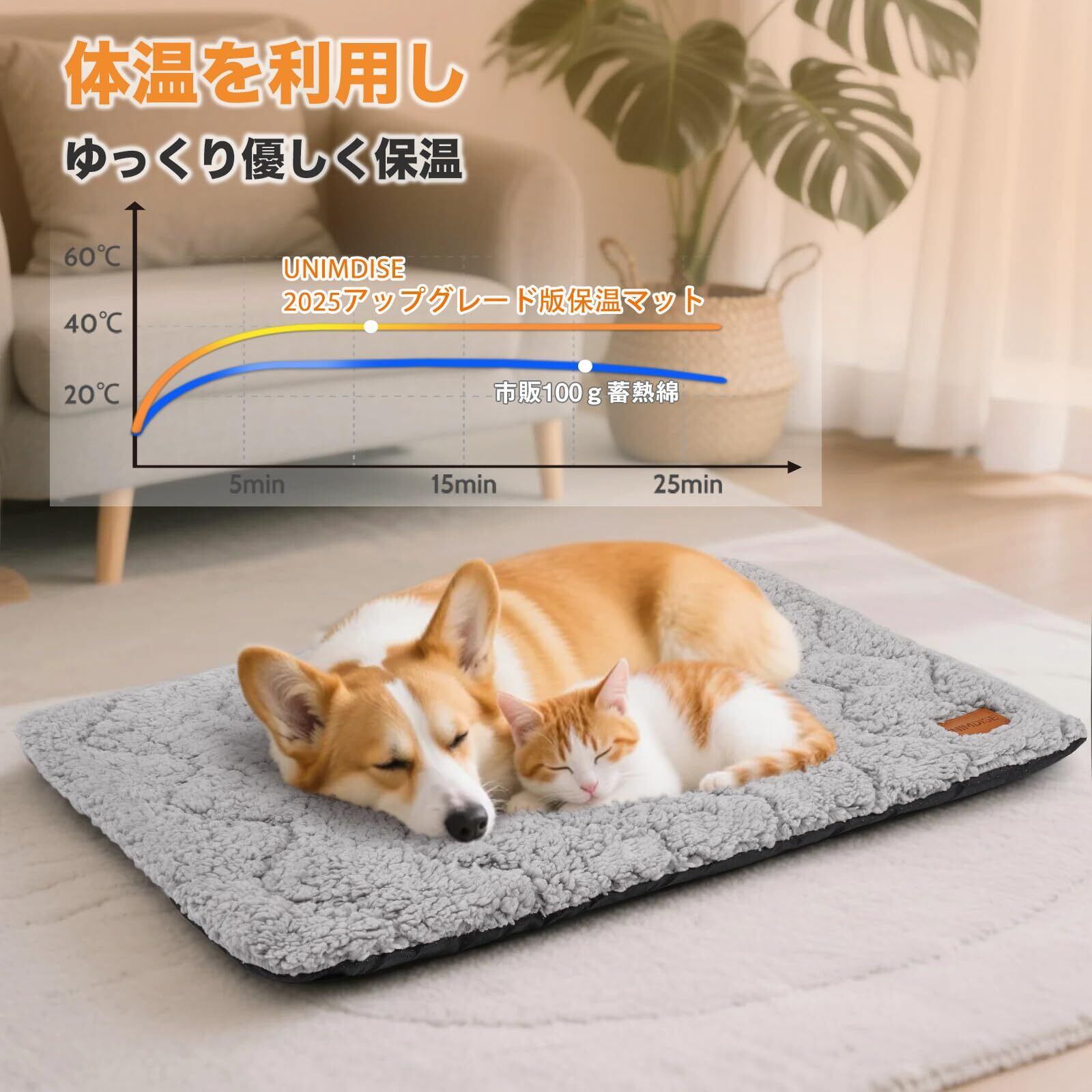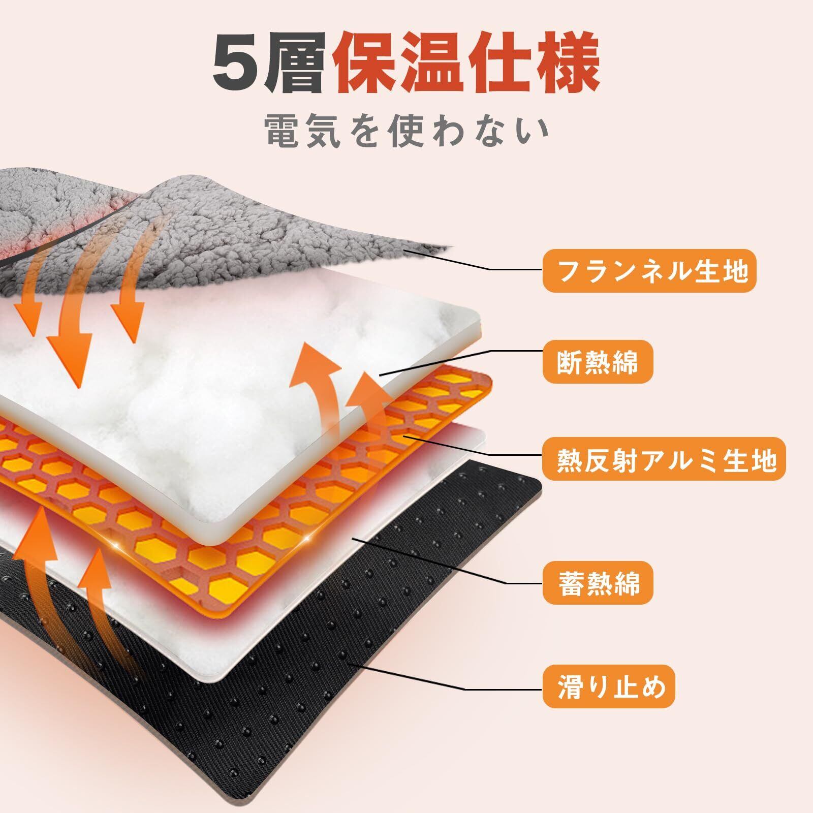 電気不要のペット用あったか防寒マットです。保温性に優れたアルミ敷きパッドでいつもポカポカです。アルミシートで体熱を反射して中わたで蓄熱保温!アルミシート無しと比較して約5.5℃暖かい。電気代もかからなければ、コードをかじって感電する心配もない。元気いっぱいの子にも安心して使って頂ける保温マットです
