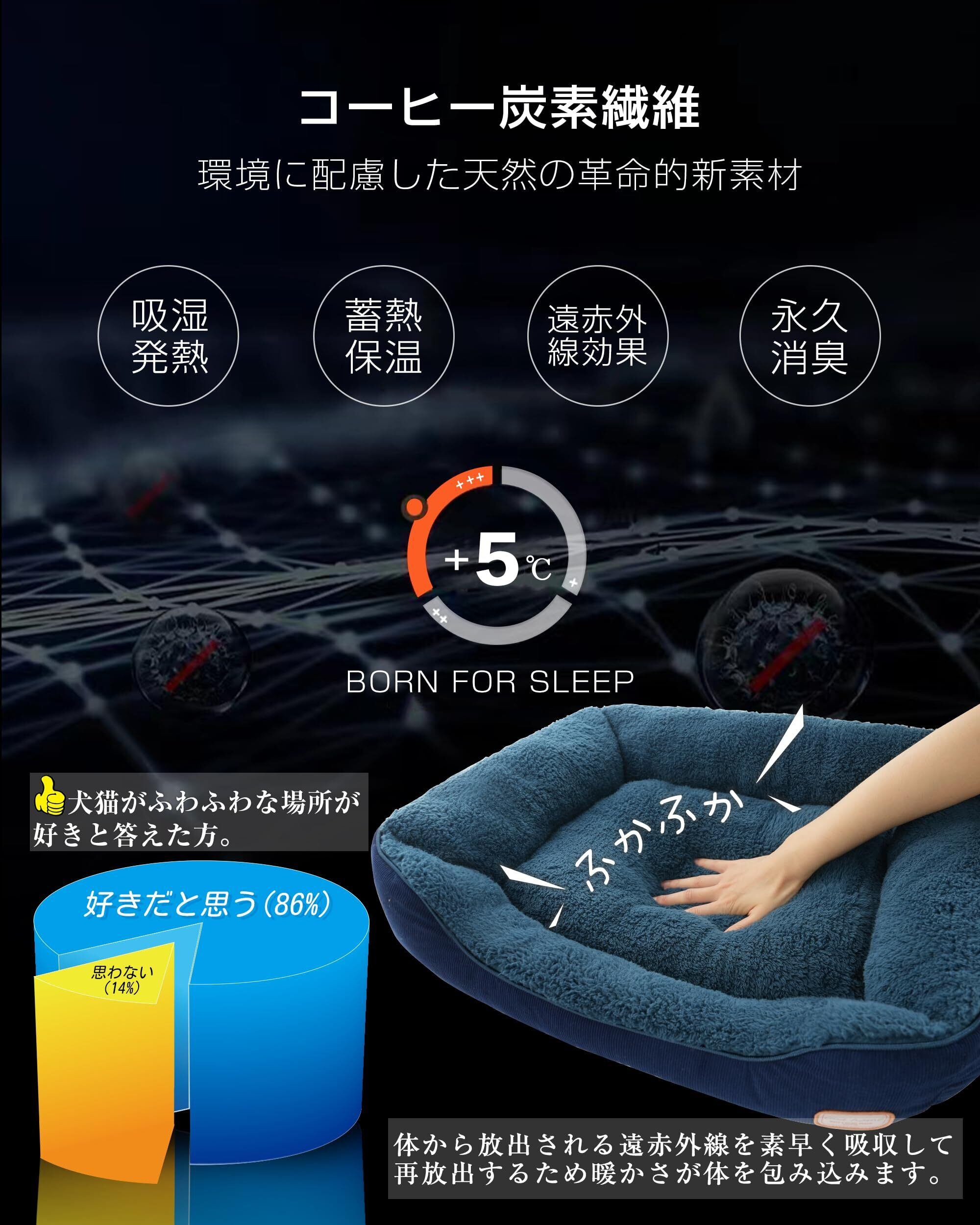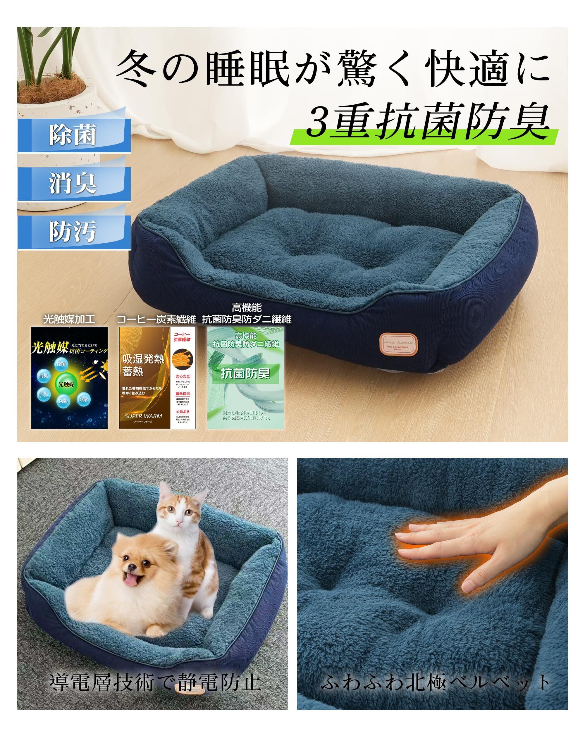 『3重抗菌防臭&清潔さと寝心地を両立!』究極の暖かさ・快適さ・清潔さを追求した温感「猫犬 ベッド 冬用」です!①高機能抗菌防臭防ダニ繊維を使用し、高い忌避効果でダニを寄せつけにくくします。また、細菌の増殖を抑制し、抗菌防臭効果を発揮します。②コーヒー炭素繊維は、臭いを吸収して消臭する天然の消臭剤です。③光触媒は、太陽光や蛍光灯などの光に反応し、含まれる酸化チタンがイオン吸着力と強力な酸化力を発揮します。これにより、有害物質を無害化・分解し、増殖を抑える環境浄化技術です。毎日、極上の睡眠をお楽しみください。