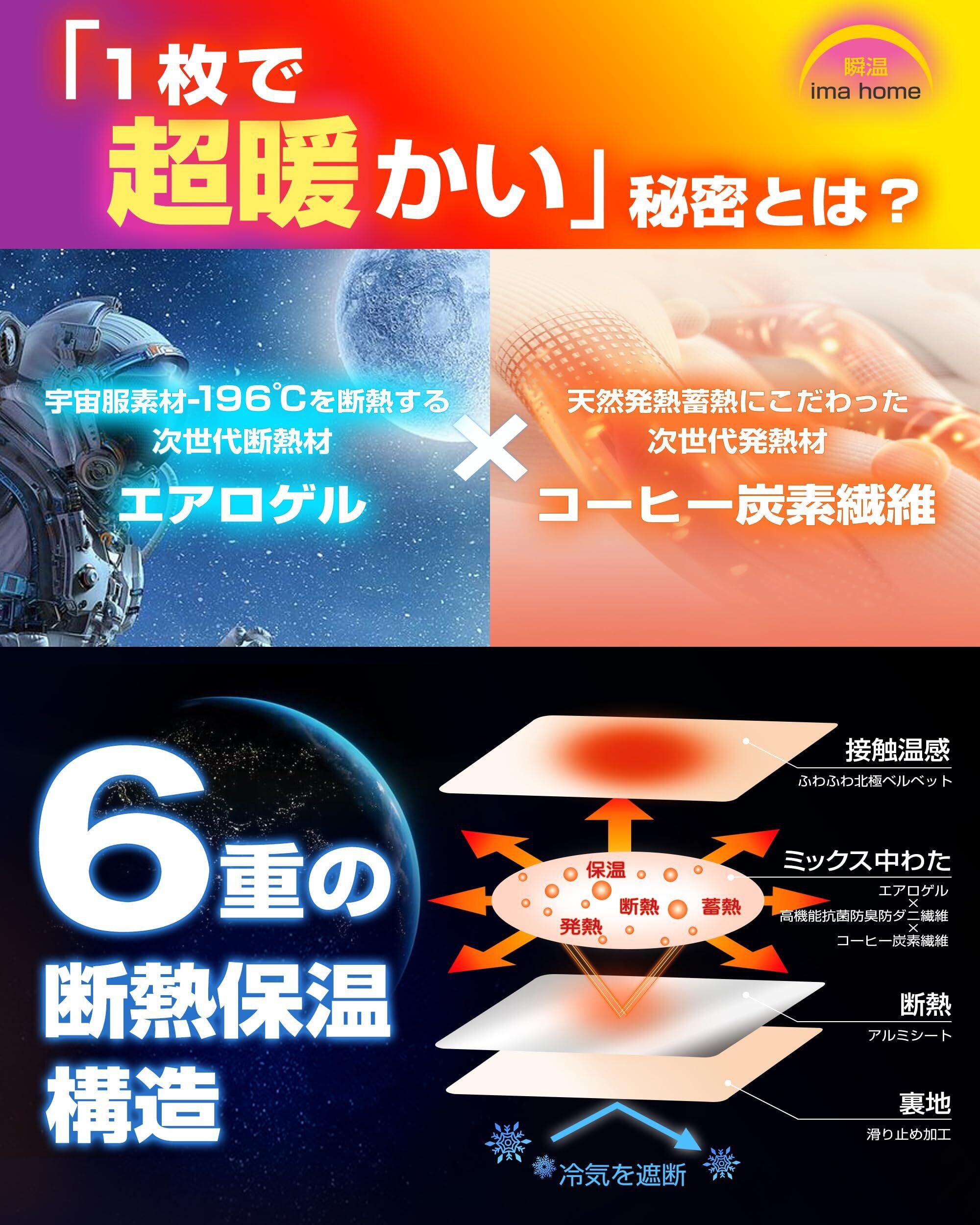 『2つの最先端テクノロジーで生まれた、未来のペットベッド』「21世紀に革命をもたらす素材」として知られる「エアロゲル」は、宇宙服にも使用されるほどの優れた「断熱性」「軽量性」「通気性」「柔軟性」「耐久性」を備えた素材です。また、「次世代の夢のような素材」とされるコーヒーファイバーは、天然の「吸湿発熱」「蓄熱保温」「遠赤外発熱」「永久消臭」の特性を持ち、環境にも配慮した素材です。これら2つの最先端素材を犬猫ベッドに使用し、究極の暖かさと快適さを実現しました。私たちにとっては小さな一歩かもしれませんが、ペットベッド(猫犬用ベッド)の世界にとっては大きな進歩であると確信しています。ぜひ、“極みの一枚”を体験してみてください。