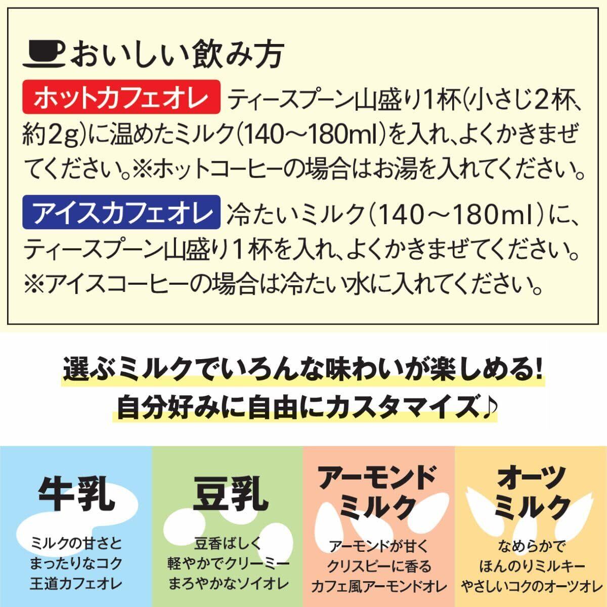おいしい飲み方:【ホットカフェオレ】:1.耐熱カップにミルクを入れます。2.ティースプーン山盛り1杯を入れ、よくかきまぜます。3.レンジで1分20秒温めてください。※ホットコーヒーの場合はお湯を入れ、かきまぜてください【アイスカフェオレ】:1.グラスに冷たいミルクを入れます。2.ティースプーン山盛り1杯を入れ、よくかきまぜます。※アイスコーヒーの場合は冷たい水を入れ、よくかきまぜてください