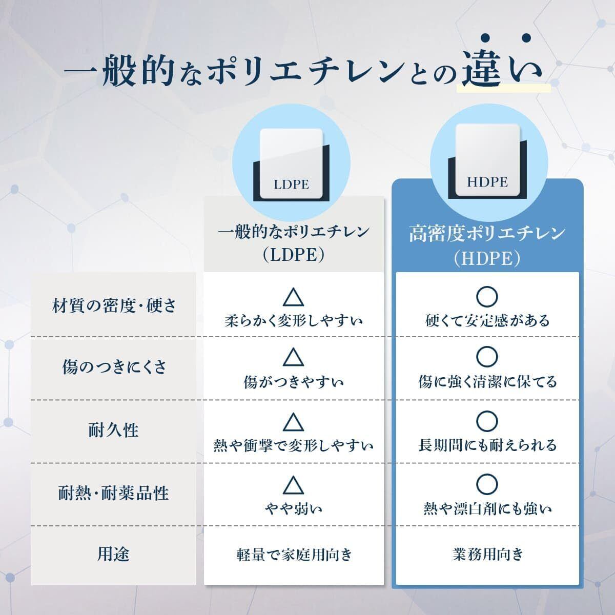【高い強度と耐久性】高密度ポリエチレン(HDPE)は強度が高いため、頻繁に使っても摩耗しにくく長期間にわたって安定して使用できます。丈夫で耐久性のある素材なので家庭用から業務用まで幅広く対応可能です。