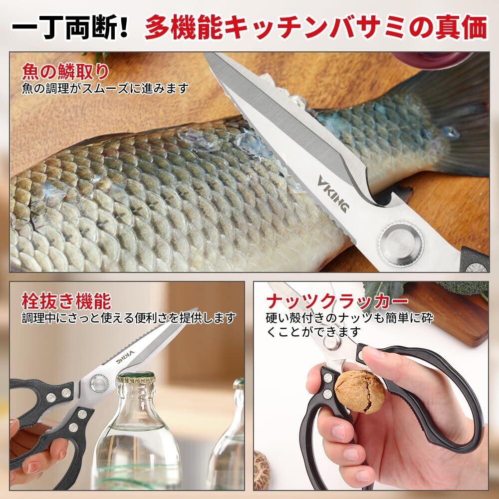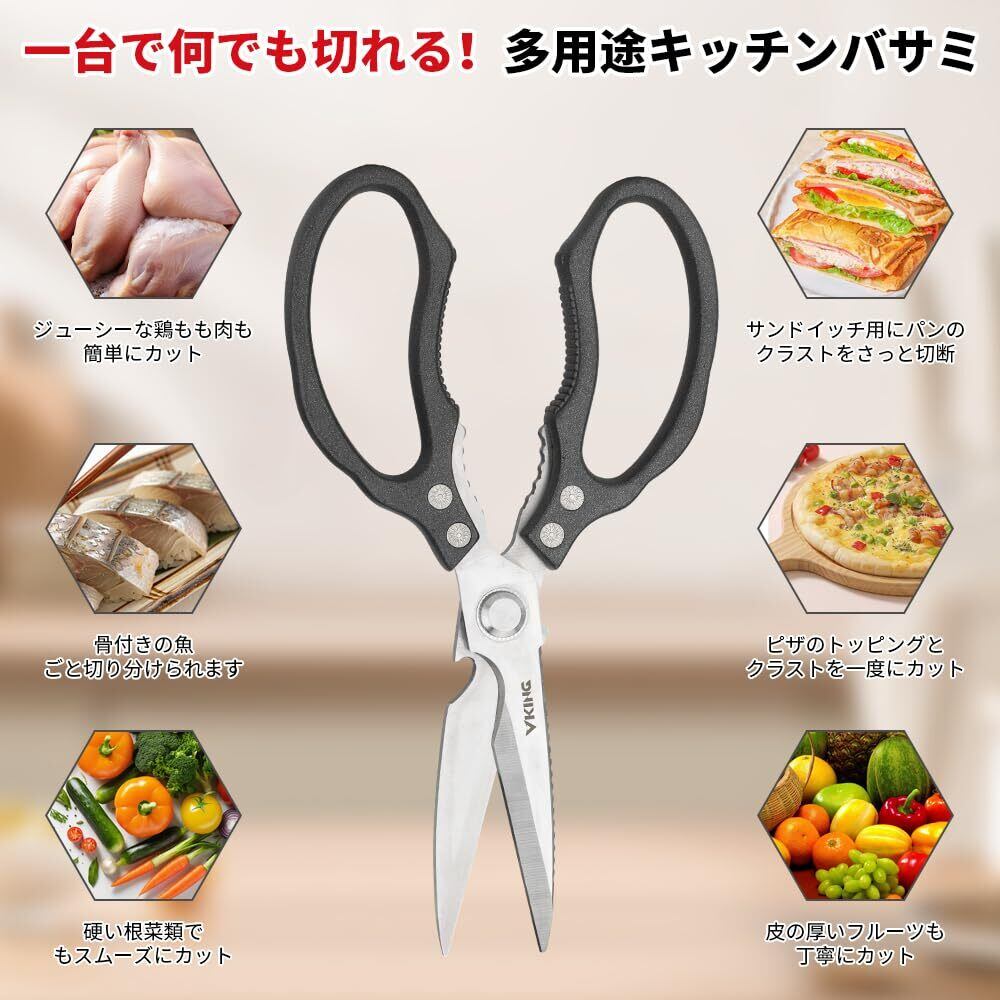 VKING 料理バサミ 多機能ハサミ キッチンバサミ - ボトルオープナー ナッツクラッカー 野菜 肉 鱼 鶏肉 家禽 魚の骨 焼肉カット ハサミ 調理はさみ 万能ハサミ ステンレス鋼 錆びにくい (ブラック)