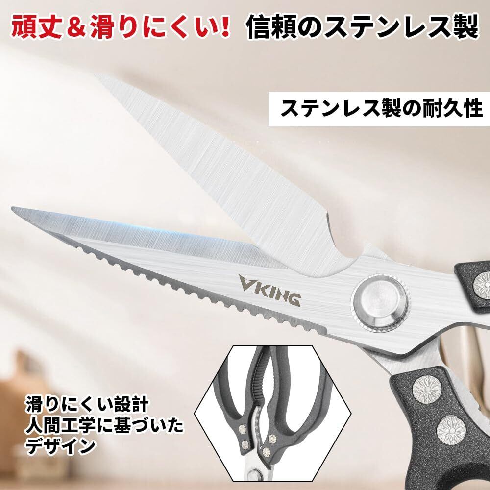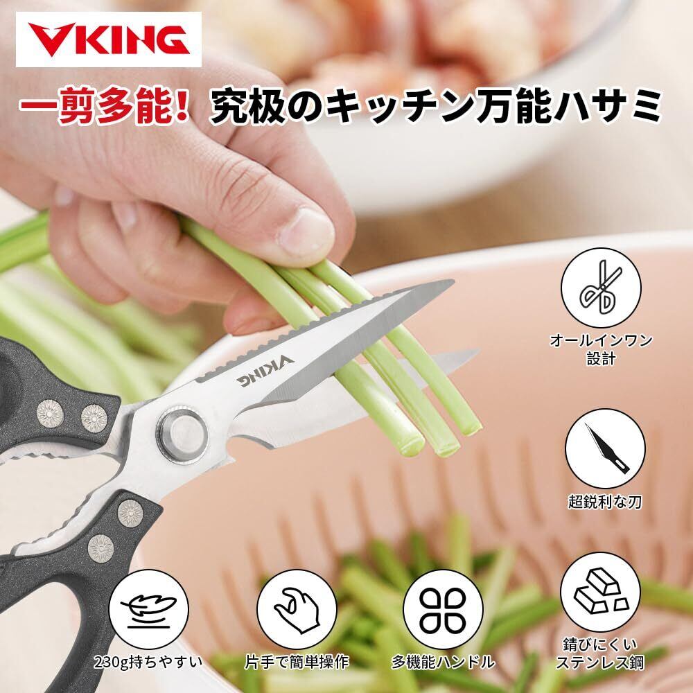 【安心の品質保証とスタイリッシュなデザイン】シンプルでありながらスタイリッシュなブラックデザインは、キッチンに映えること間違いなし。VKINGの製品には安心の品質保証が付いており、購入後も安心してお使いいただけます。どんな場面でも頼りになるキッチンバサミを、この機会にぜひお試しください。