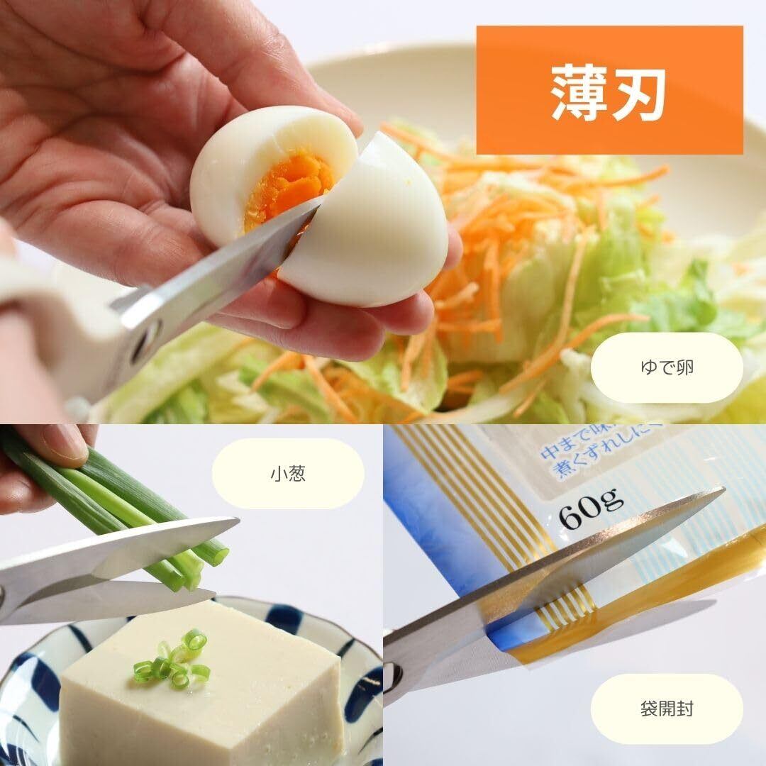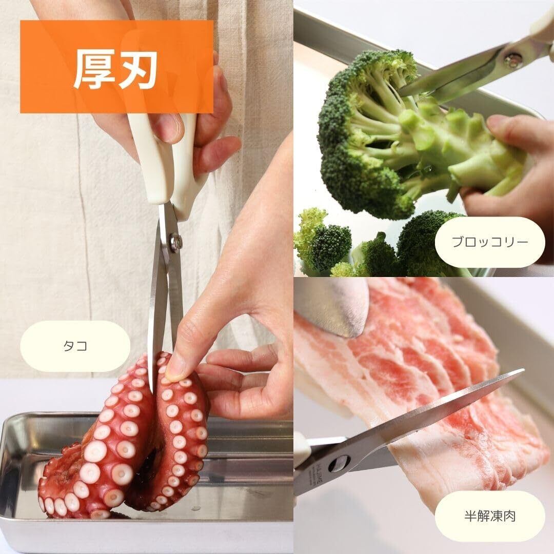 【薄刃+厚刃のハイブリッド!1つで幅広く対応!】十分なサイズながら、一般的なキッチンバサミの約半分の重さ。無駄を削ぎ落した、軽量ですっきりしたデザインの「キッチンバサミ」薄刃+厚刃のハイブリッドで、半解凍肉、ブロッコリーなどの硬い食材、タコなどの滑りやすい食材、ゆで卵などの柔らかい食材や、小葱のカットなどの細かい作業まで、1本で幅広く対応!心地の良い切れ味でスムーズにカットすることができます。