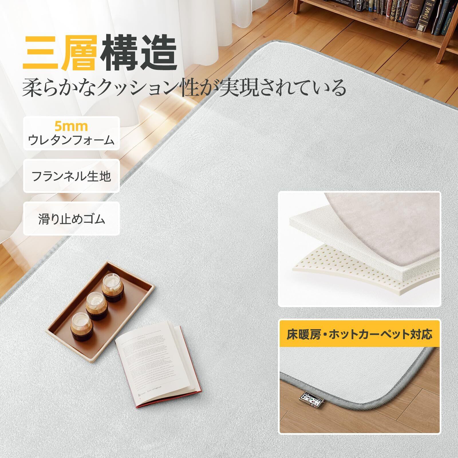 【北欧無地仕様】サイズ:135×185cm 約1.5畳 表地:ポリエステル75%棉25% 約4mm 中材:ウレタンフォーム約5mm 裏面:不織布(滑り止め加工)約2mm 重さ:約1.1kg