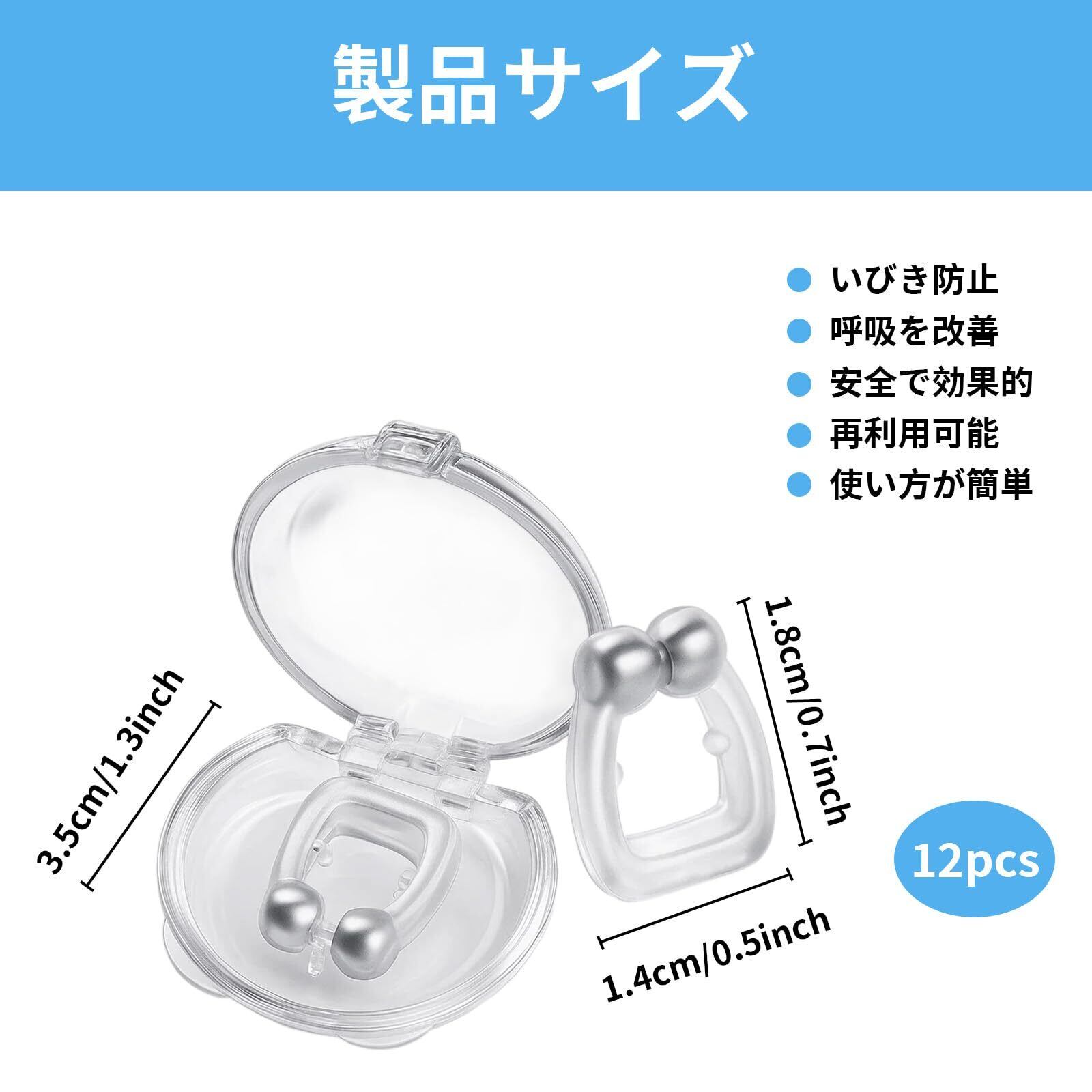 肌に優しいシリコン素材を採用し、洗って繰り返し使用可能。軽量で目立たず、就寝中の寝返りでも外れにくい設計です。12個セットなので、ご家族や友人と共有いただけます。