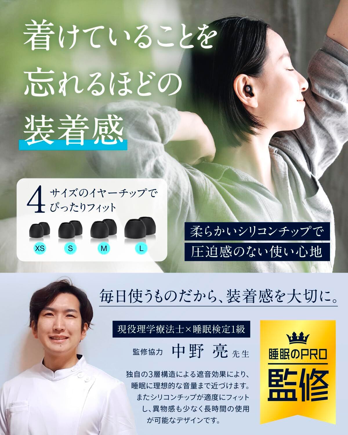【長時間快適な着け心地】 イヤーチップ は肌に優しいソフト シリコン製 で入眠から起きるまで快適な着け心地です。4サイズ(SS,S,M,L)同梱で使用者に合わせたサイズを選択することで長時間使用しても違和感なく、むしろ着けていることを忘れるときも。さらに オシャレ も考慮された上質なフィット形状ですので、横向きになっても圧迫されにくいシンプル設計な 睡眠グッズ です。