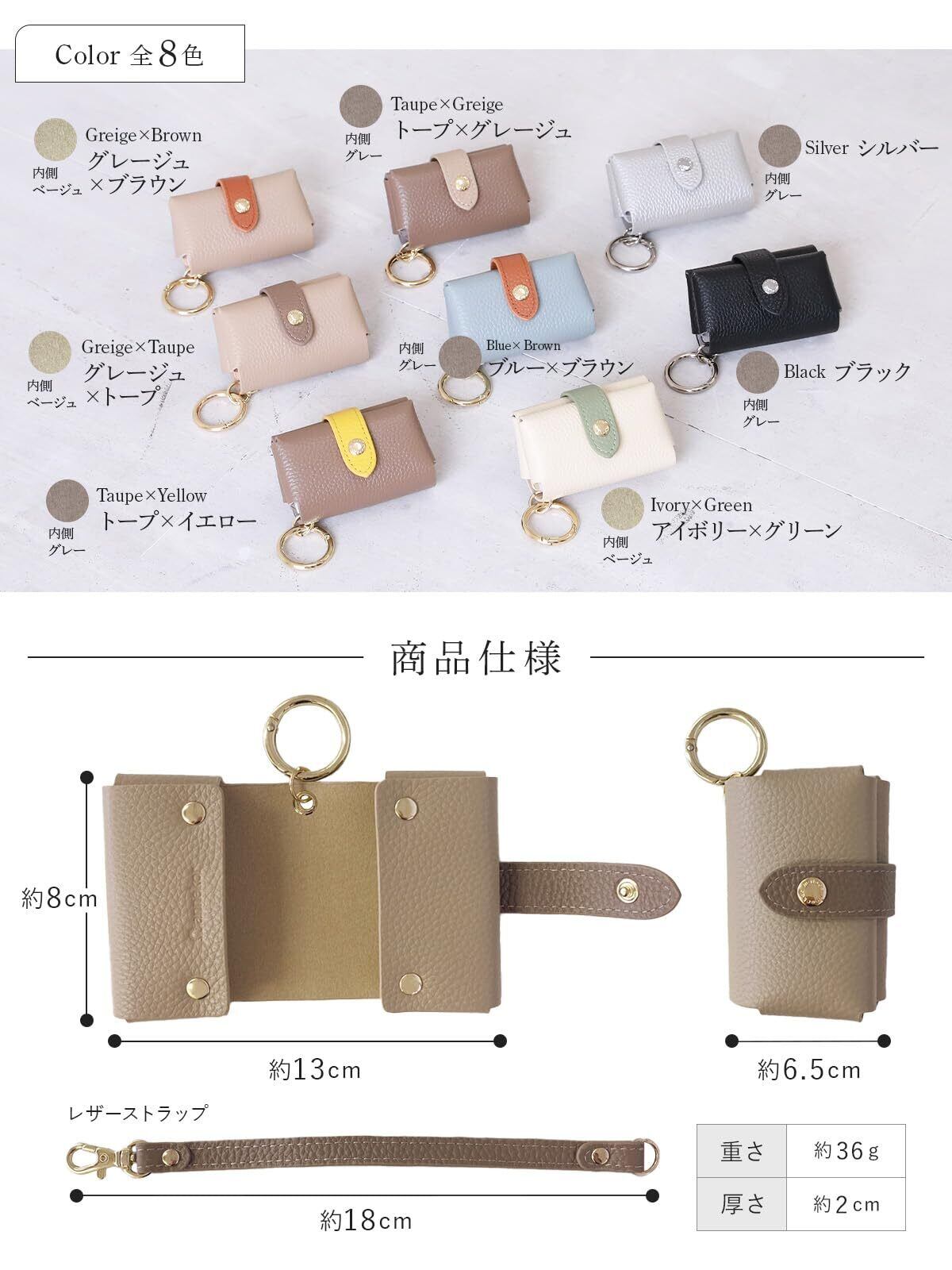 【コンパクトで軽量】 持ち運びにちょうどよく、荷物の邪魔をしないサイズ感です。サイズ:縦8㎝×横6.5㎝×奥行3㎝/ストラップ長さ:約18㎝/重さ:約36g。