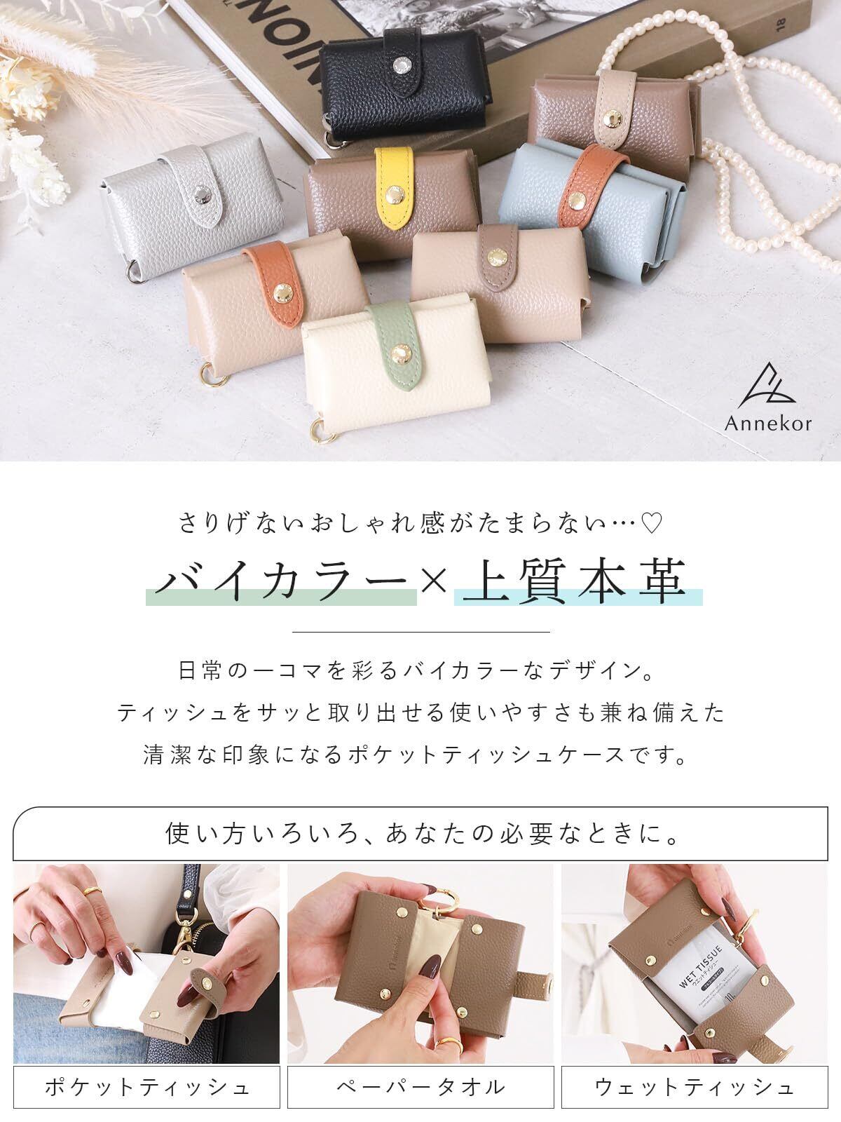 Annekor ポケットティッシュケース 【バイカラー 本革ストラップ付】 本革 ポーチ レディース 持ち運び ポケットティッシュ カバー ちり紙 シンプル カジュアル メンズ [アンコール] (ブラック)