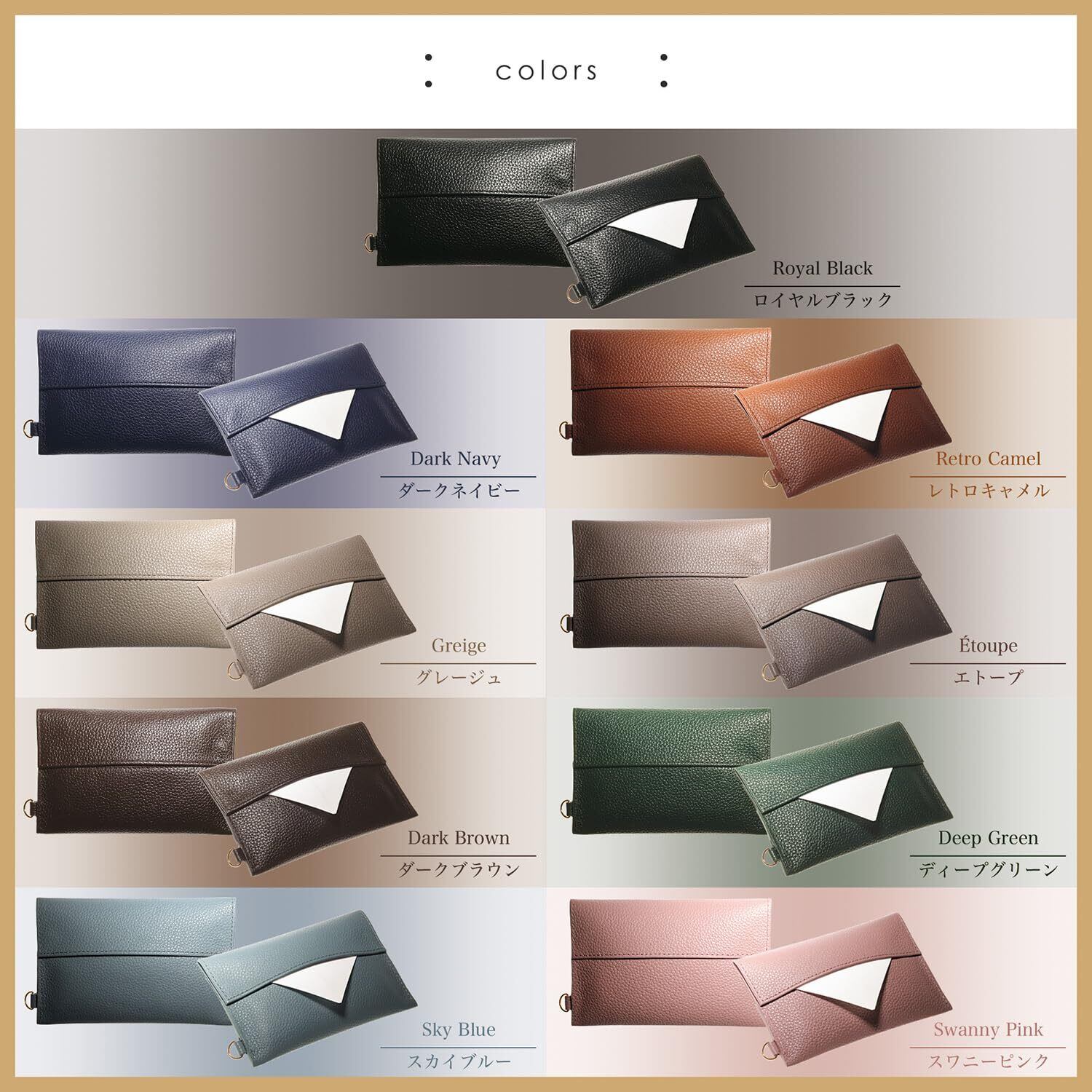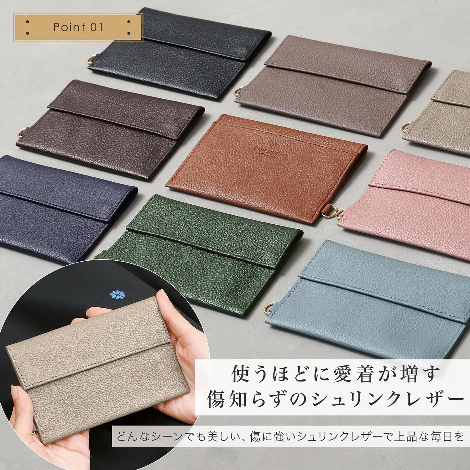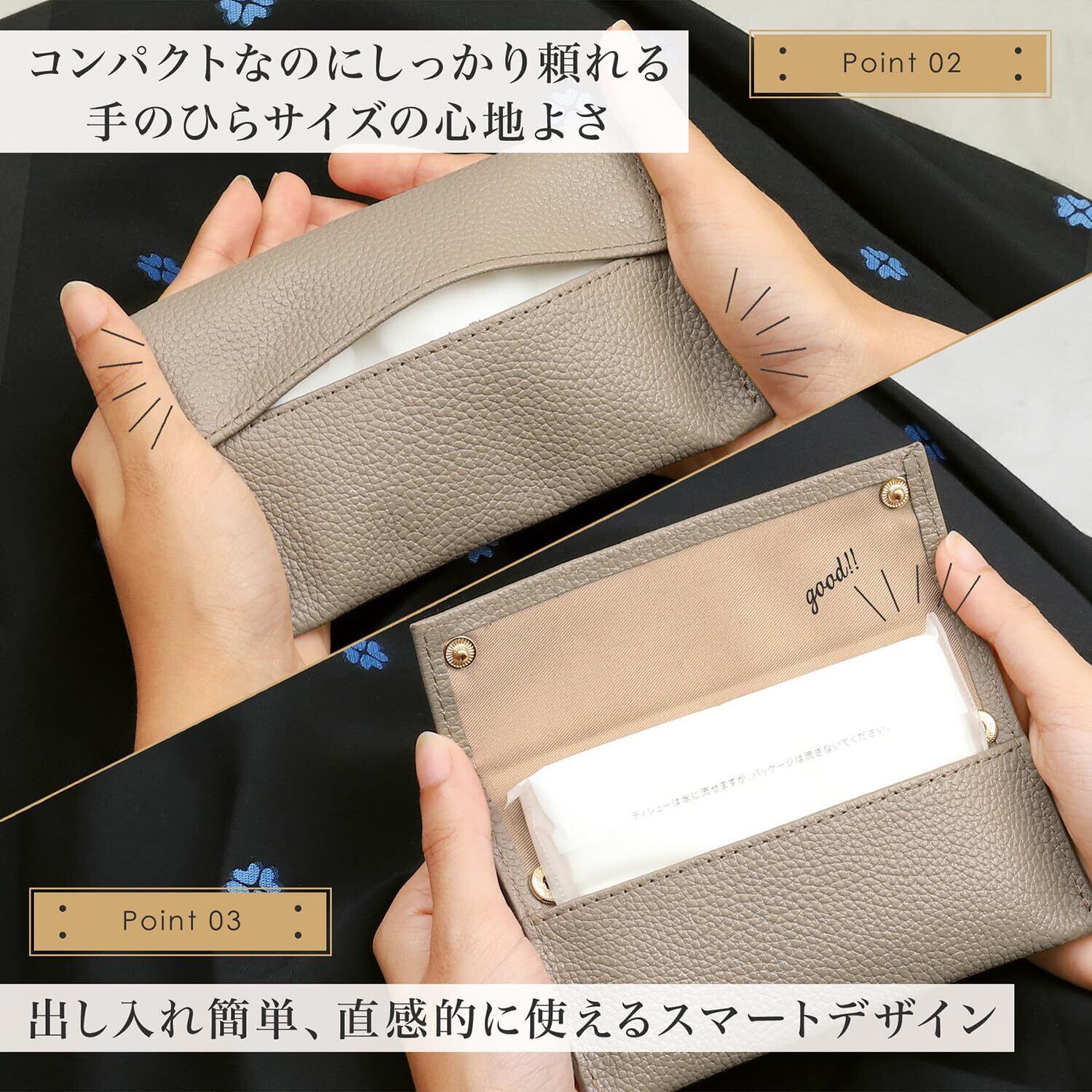 【こだわりの素材と機能性】厳選された上質なシュリンクレザーを使用し、しっとりと手に馴染む質感と高級感ある風合いを実現しました。見た目の美しさだけでなく、使い込むほど手に馴染む本革ならではの魅力をお楽しみいただけます。コンパクトなサイズ感ながら、ポケットティッシュを最大2つまで収納可能な大容量設計。日常使いはもちろん、ビジネスシーンでもスマートに活躍する、機能性とデザイン性を兼ね備えたアイテムです。
