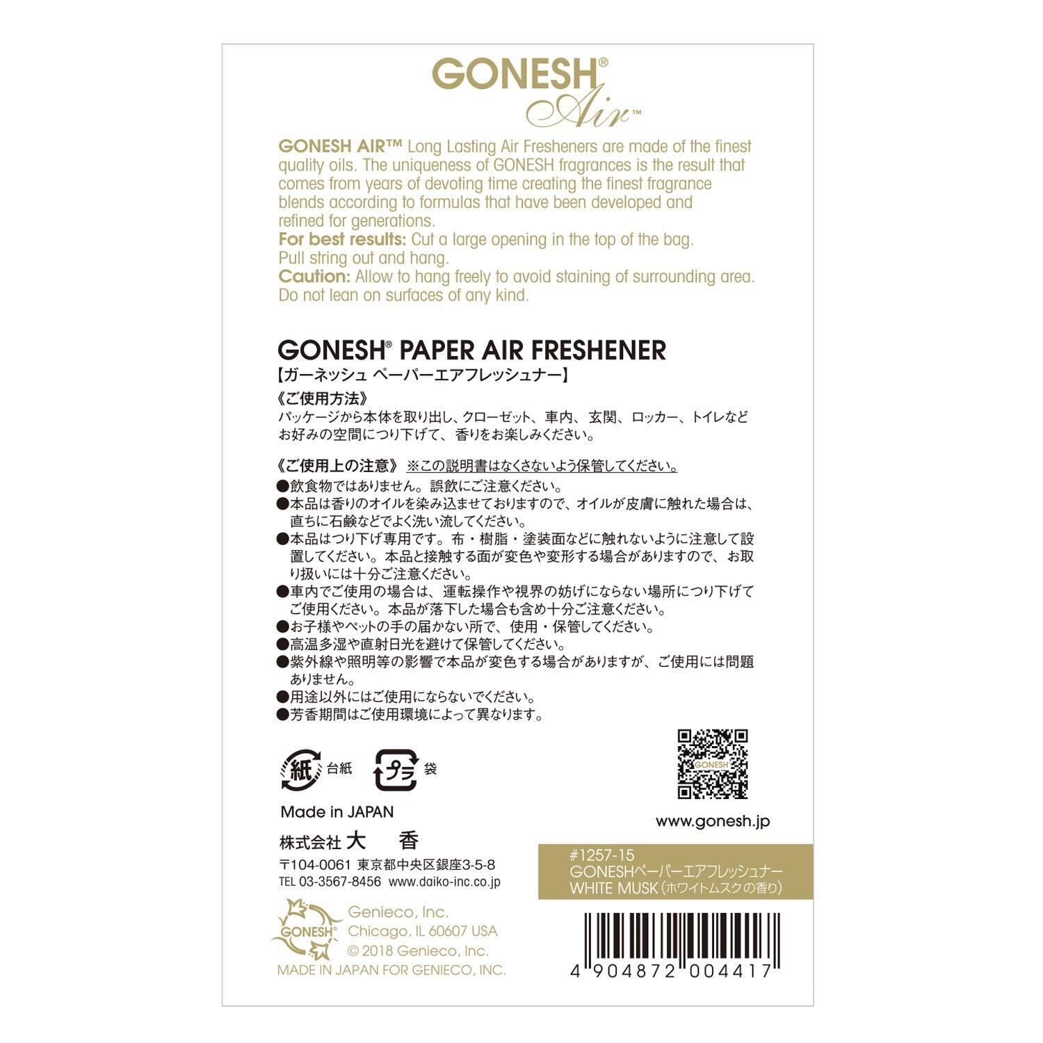 GONESH(ガーネッシュ)ペーパーエアフレッシュナー(吊り下げ型芳香剤)ホワイトムスク(シャボンの香り)1個