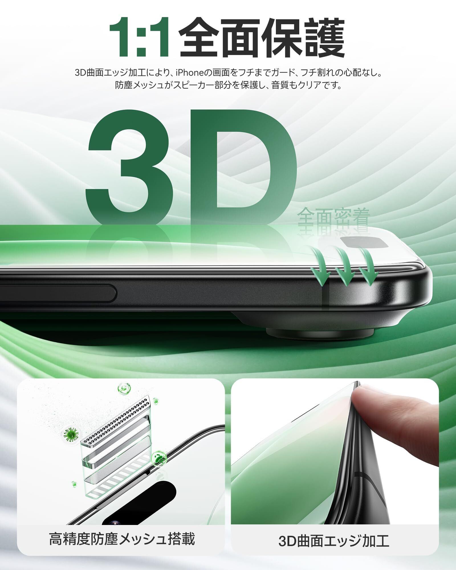 「極細黒縁・全面保護」3D曲面エッジ加工を採用したフルカバー設計で、端までぴったり貼れるため、縁割れの心配がありません。落下や衝撃による損傷からスマホをしっかり保護します。防塵メッシュがスピーカー部分をカバーするため、通話や音楽などの音量への影響を与えません。アイホン エアーのディスプレイベゼルよりもさらに極細フレームにより、画面の表示領域を最大化し、没入感のあるディスプレイ体験を実現します。