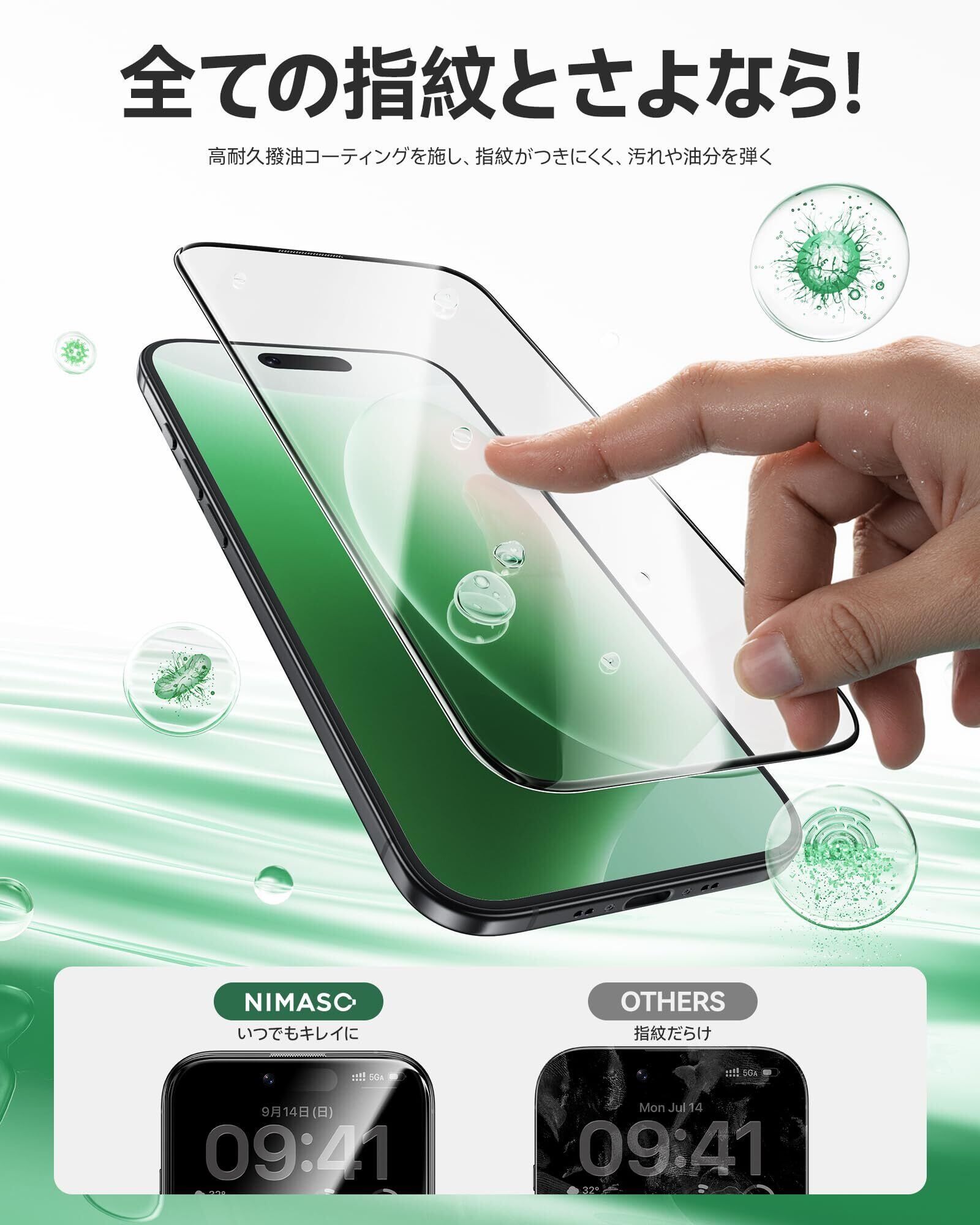 「指紋防止・滑らかな触り心地」:いphone air 保護フィルムは撥水撥油のAF(Anti-Fingerprint)コーティング加工とスムーズタッチ加工により、指紋や汚れがつきにくく、油分や水分が強く付着した汚れや指紋がついても、拭き取るだけで綺麗になります。また、使用時の手触りも滑らかで、毎日の動画視聴や仕事、勉強、ゲームなどのあらゆるシュチューションでも、常に美しい画面をお楽しみいただけます。