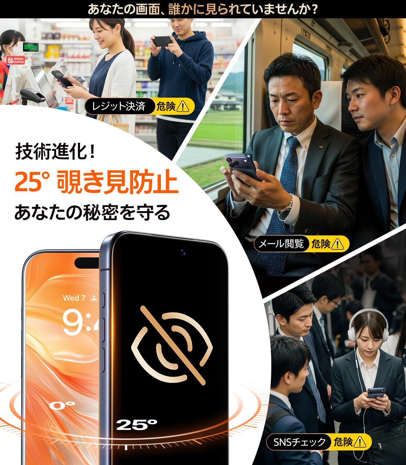 【覗き見完全シャットアウト!100%プライバシー保護】TORRAS独自の偏光フィルター技術とマイクロルーバー設計により、他の保護フィルムでは体験できない圧倒的な覗き見防止効果を実感できます。満員電車、カフェ、レジでの操作、SNSや写真閲覧でも、あなたのiPhone Air 画面は完全なプライベート空間に。25°の超狭角で周囲の視線をしっかり遮断しつつ、真正面の鮮やかさはそのまま保持。誰にも覗かれず、安心してプライベートな操作が楽しめます。 (TORRASの iPhone Air保護フィルムは専用設計で1:1完璧フィットで、全機能安心使用可能です。) TIPS:貼り付け後、顏認証を再設定するのは必要!