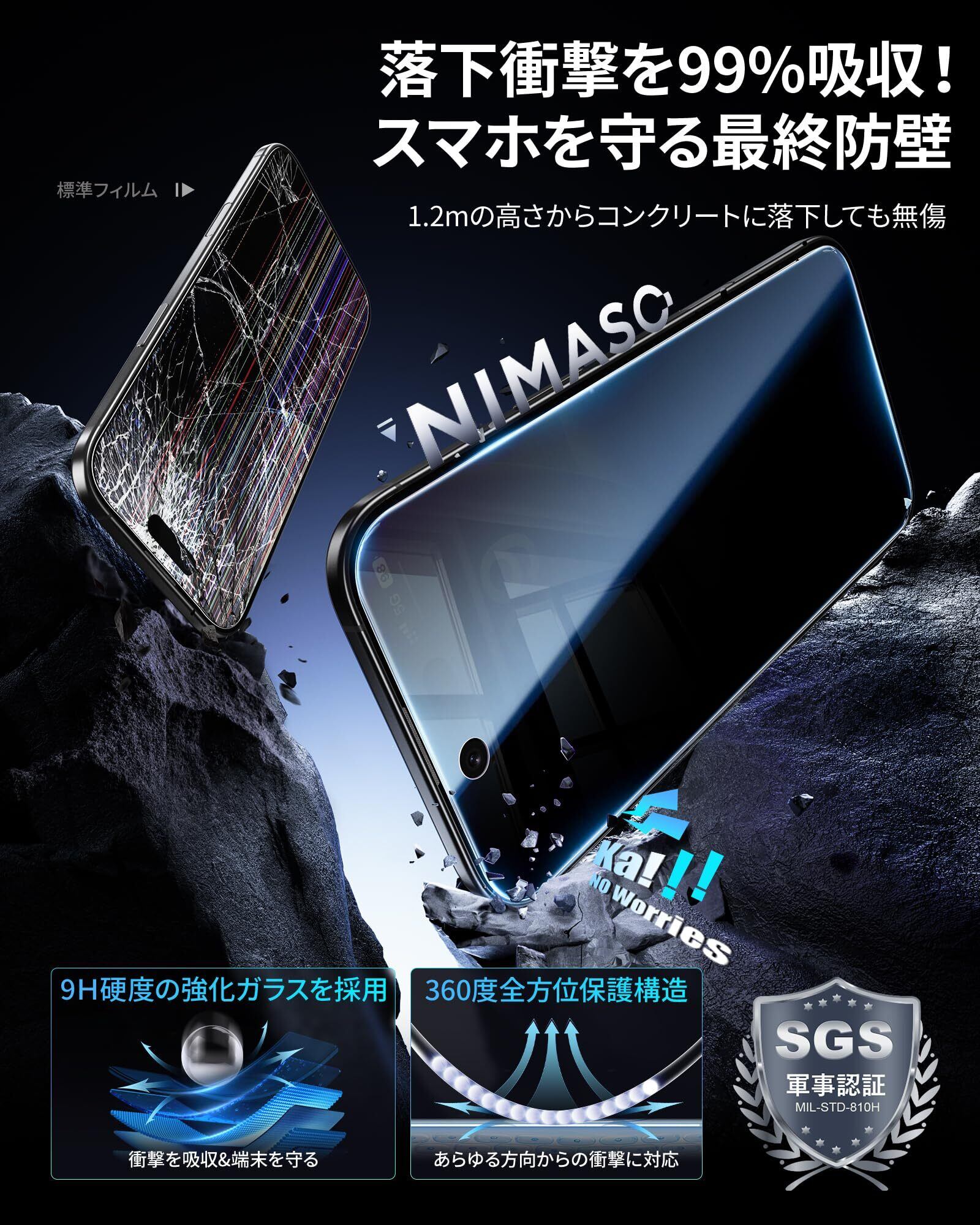 「耐衝撃性UP・飛散防止」米軍規格「MIL-STD-810H」に準拠(認証番号:SZXEC23002005001)9H表面硬度ガラスを採用しており、外部からの衝撃を吸収し、いphone air画面へのダメージを最小限に抑えます。鞄やポケットのなかで、鍵などの鋭いものにぶつかっても傷が付きにくいです。飛散防止加工により、万が一割れてもガラス破片が飛び散ることなく安心して使えます。