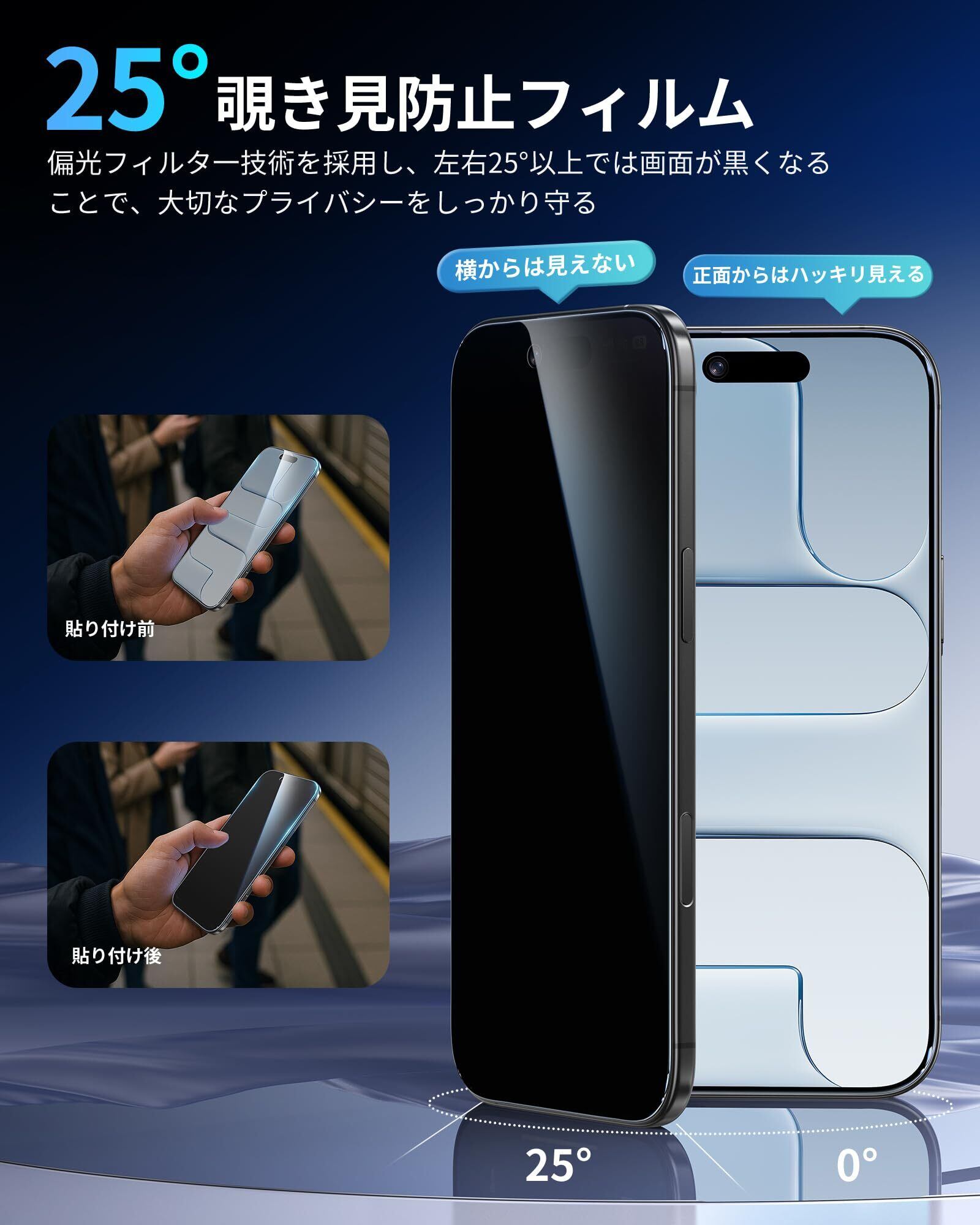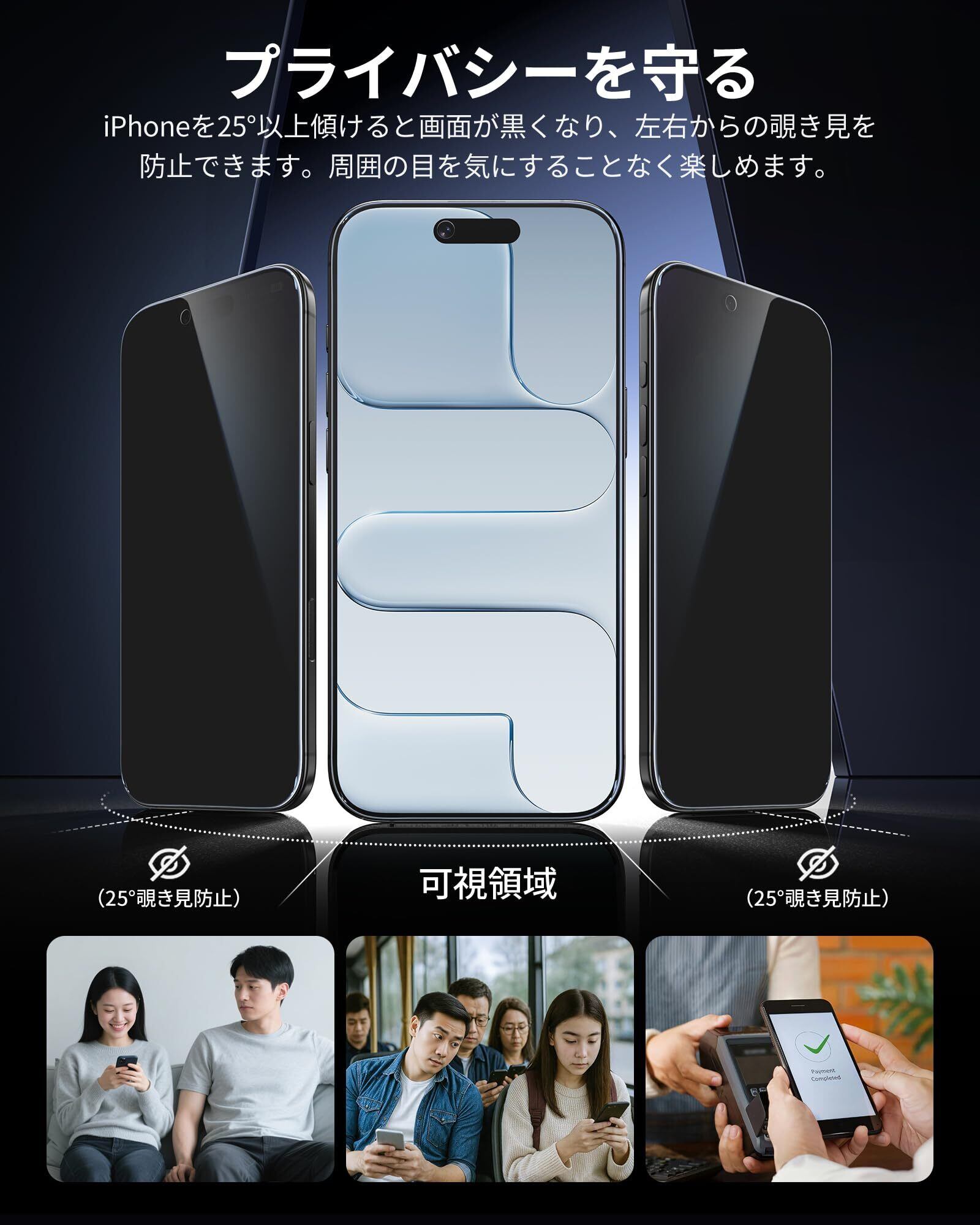 「25°覗き見防止」特別なブラインド加工により、iPhoneを左右に25°以上傾けると画面が黒く見えなくなるため、左右からの覗き見を防止できます。正面から見たときの透過率は高く、アイフォン エアー本来の液晶画面をお楽しみいただけます。Face IDの認証も問題ありません。あなたの大切なプライバシーをしっかり守ります。公共の場でも周りの目を気にせずにアイフォンをお楽しみいただけます。